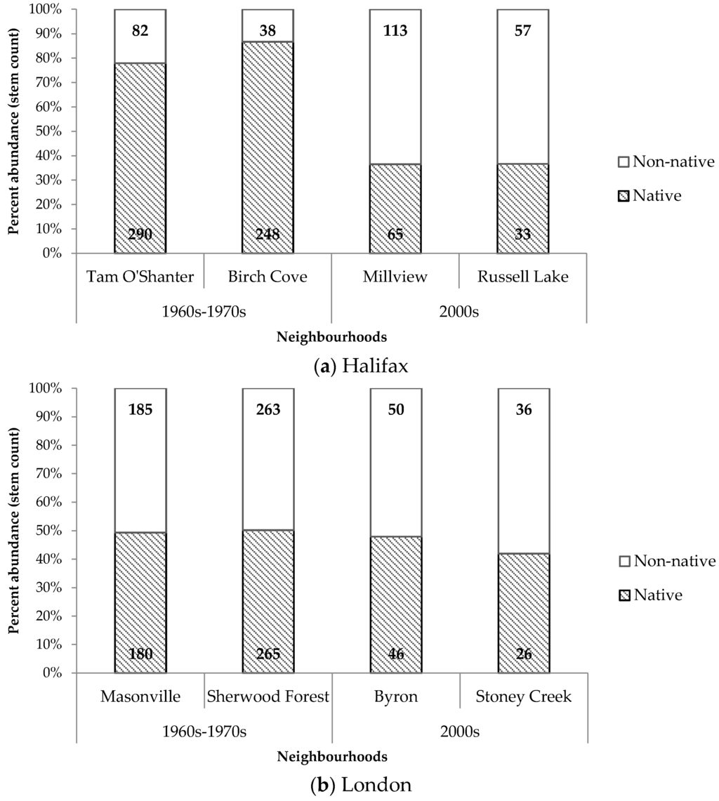 Counts and proportions of native and non-native trees for residential property trees in each neighbourhood: (a) Halifax; (b) London.