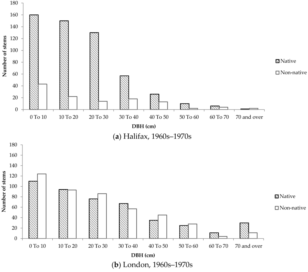 Size-class distribution of native and non-native trees on residential properties in neighbourhoods developed in the 1960s–1970s in: (a) Halifax; (b) London. Trees with a DBH = 10 cm, 20 cm, etc. are included in the lower histogram bin.