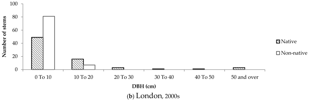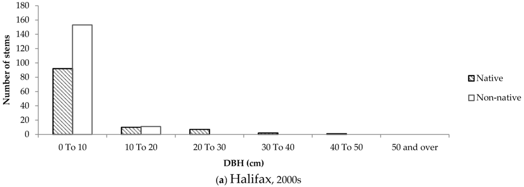 In newer neighbourhoods, the size-class distribution of native and non-native trees was similar across both cities (Figure 9). Some older native trees were left standing in developments in both cities, while non-native trees dominated newly planted stems.