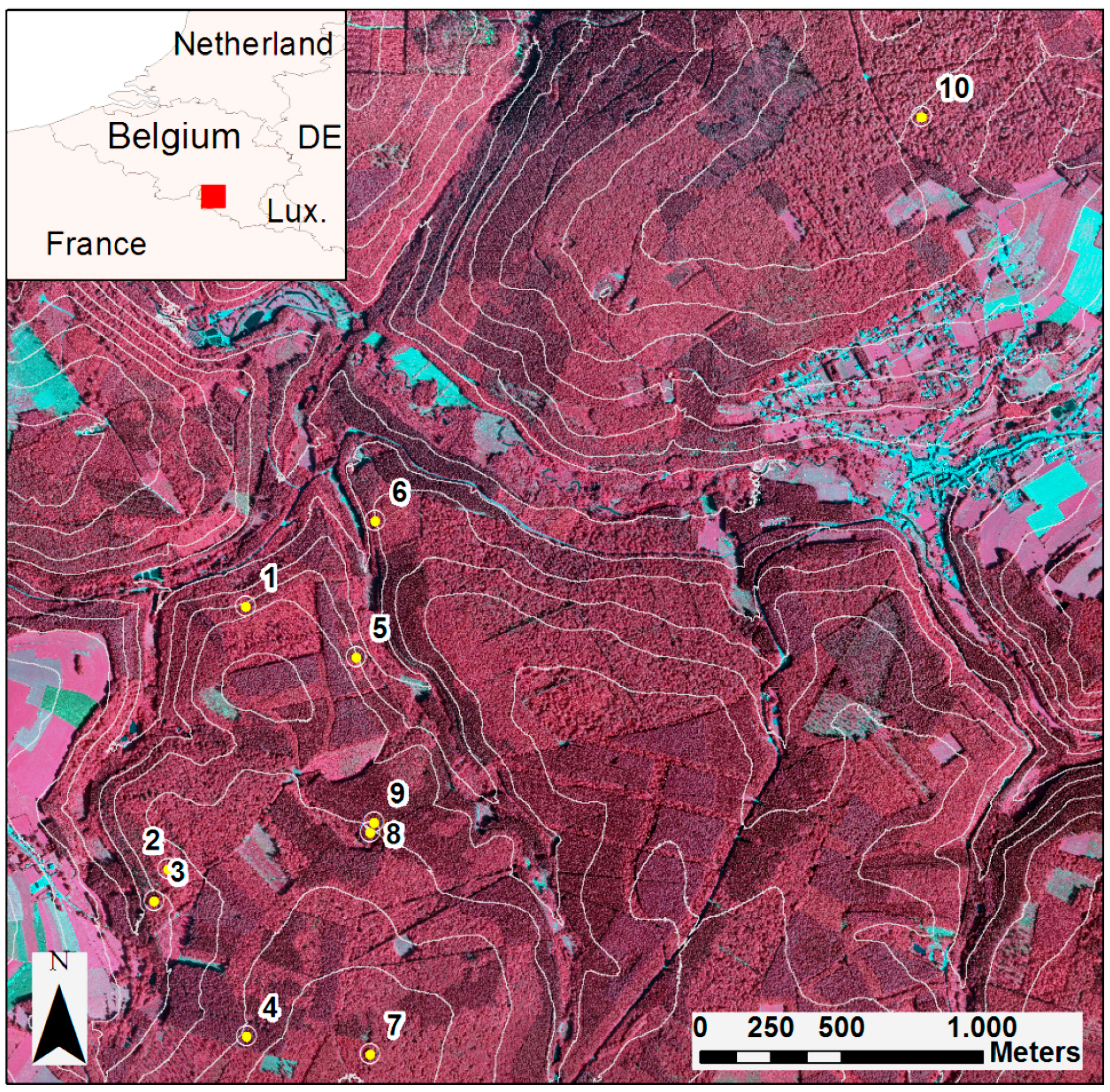 The study area is located in the south of Belgium, close to the town of Vencimont, which is part of the Ardenne natural region. In the surroundings a large variety of forest types occur, ranging from young production forests to old growth forest. The area has an average elevation of approximately 200 meters and is characterized by gentle hills, with elevation differences of approximately 100 meters. The climate is temperate maritime, with cool summers and moderate winters, and precipitation in all seasons (Köppen: Cfb). Ten plots were laid out during the leaf-on period in varying forest types, forest structure, and covering different slope classes (Figure 1, Table 1 and Figure S1). The plots were selected in such a way that the maximum variation in forest types (broadleaved, coniferous, and mixed), tree density (NHA from 113 to 1344 trees/ha), and terrain properties (flat to steep) was achieved.