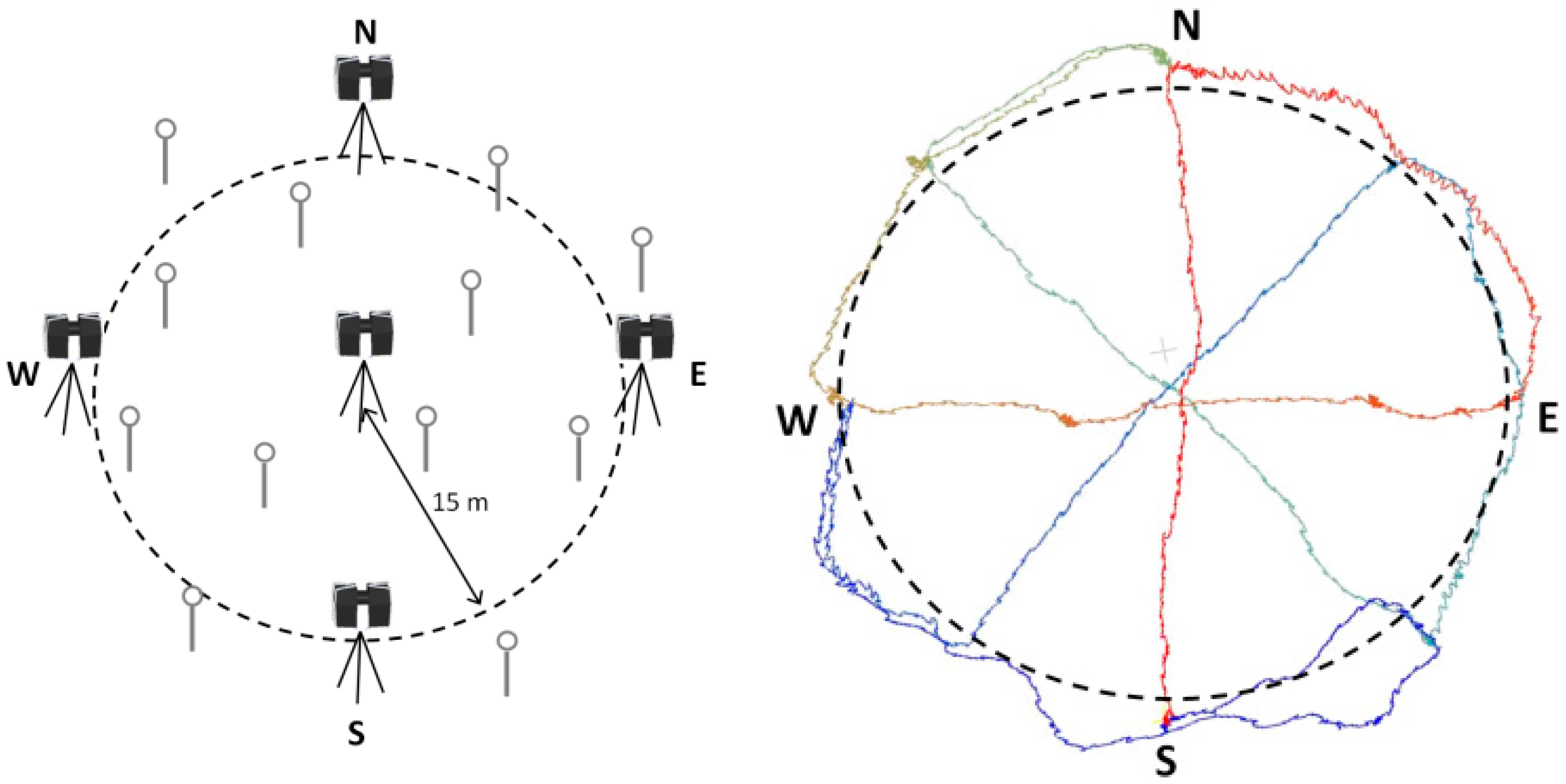 Locations of the TLS and the spheres (left) and walking pattern for the HMLS data acquisitions (starting in red and ending in dark blue) (right).