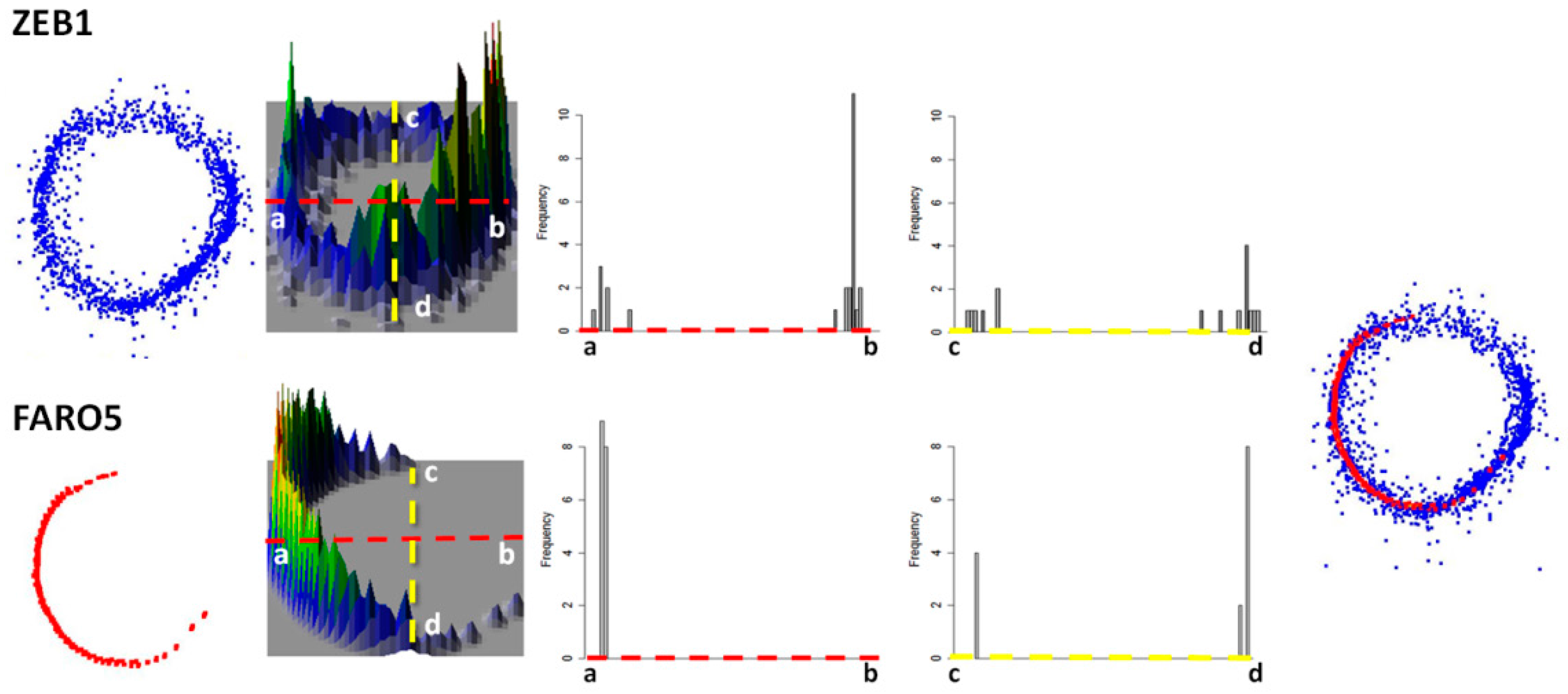 Comparison of a 1.3 m height slice of the point cloud (thickness of 10 cm) of one Picea abies stem scanned with the hand-held mobile laser scanning ZEB1 and with the multiscan method (FARO5). From the left, we have the top view of the slices, the 3D density graph of the slices, histograms of transects within the slices with bins of 5 mm (red dotted line are transects following the x axis and the yellow dotted line are transects following the y axis) and, finally, on the right, we have an overlay of the ZEB1 slice and the FARO5 slice.