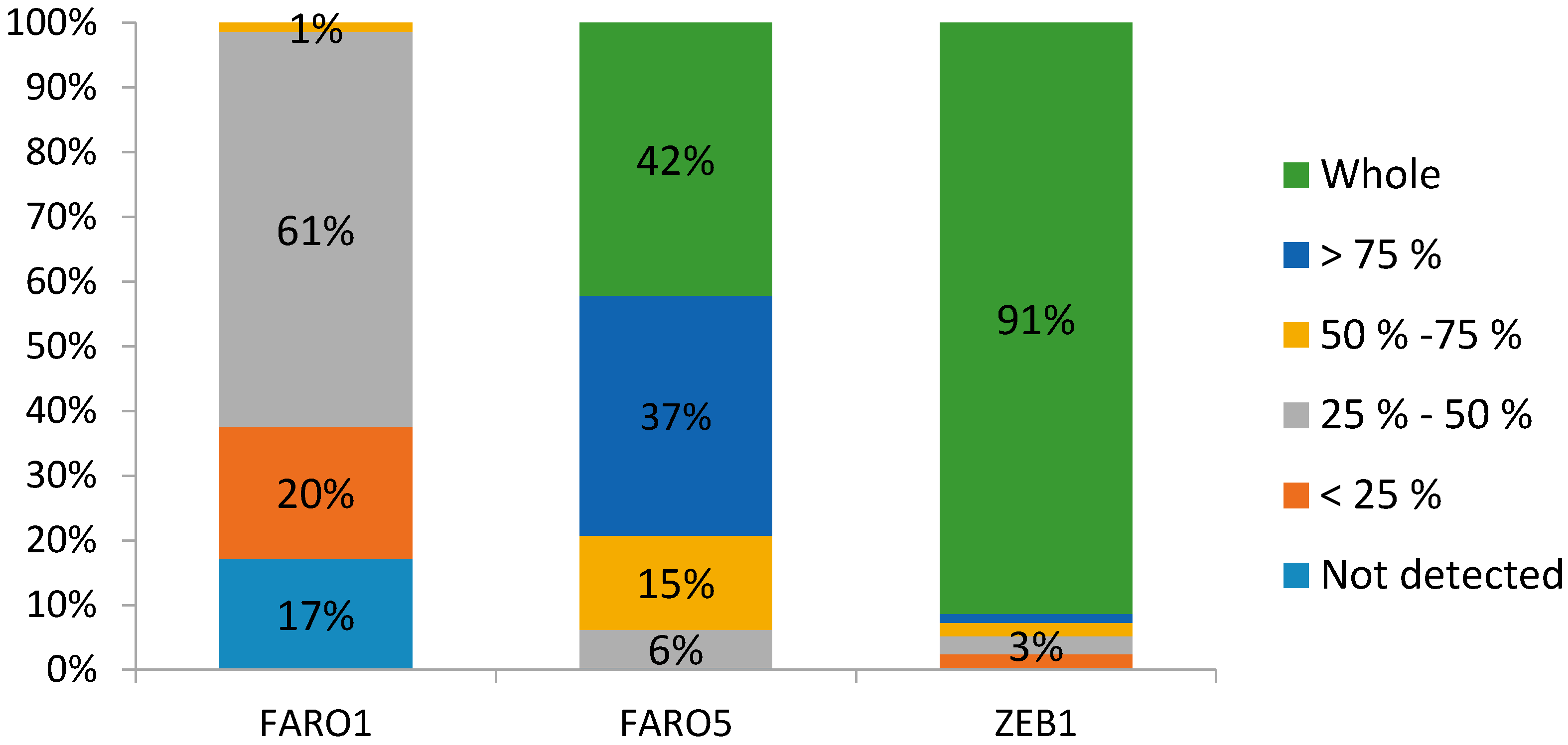 In the eight plots studied, the number of trees detected from the LiDAR scans compared to the field inventory data shows that all the trees (DBH > 10 cm) were detected with the FARO5 and ZEB1 scanning method, whereas 17% of the trees are not detected when using a single scan (FARO1) (Figure 4). Due to the high number of scan positions with the ZEB1, this method results in the best spatial cover throughout the plot. As a result, the percentage of trees for which more than half of the cross-section is scanned is 1%, 79%, and 93% respectively for FARO1, FARO5, and ZEB1 setups (Figure 4). The whole cross-section is scanned for no trees with FARO1, for 42% of the trees with FARO5, and for 91% of the trees with ZEB1. The observations of the cross-section at 1.3 m height further showed that two trees were measured twice during the field survey in the dense plot 8, indicating that errors may also occur in field inventories.