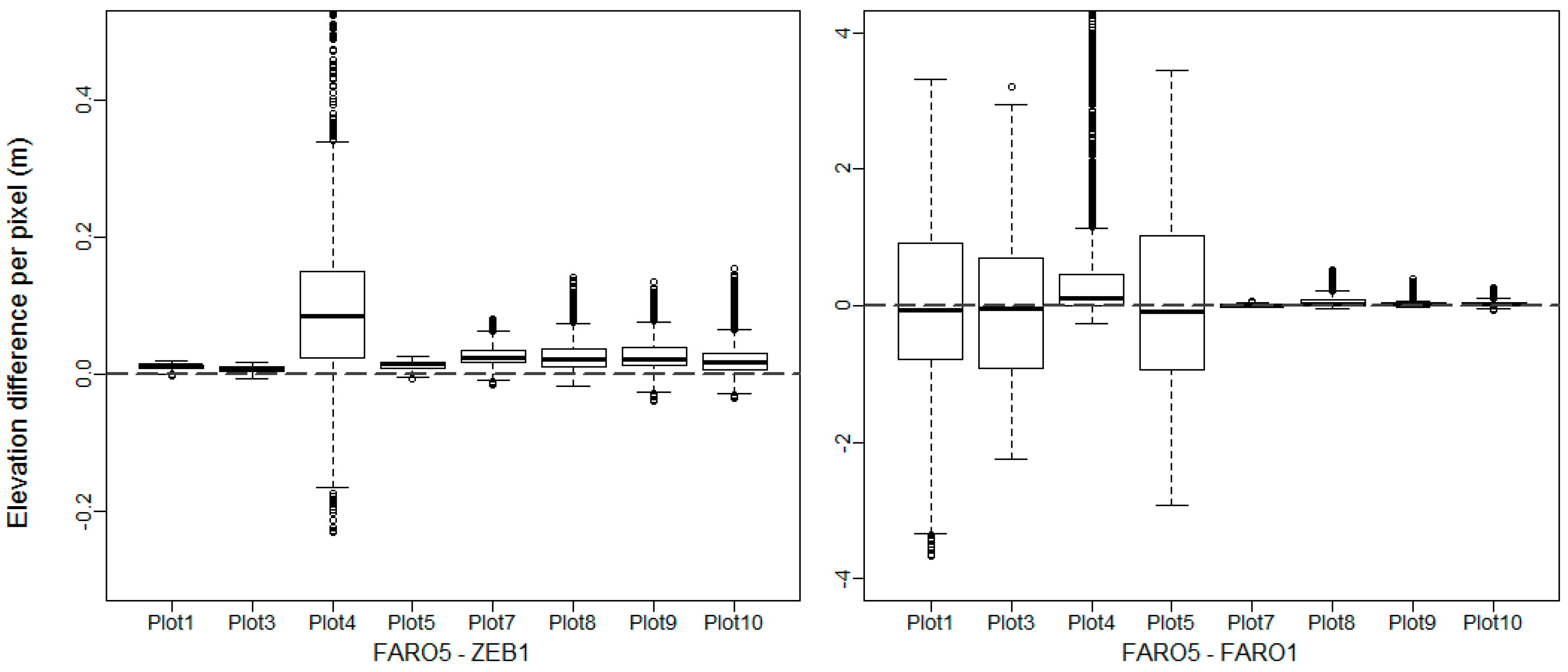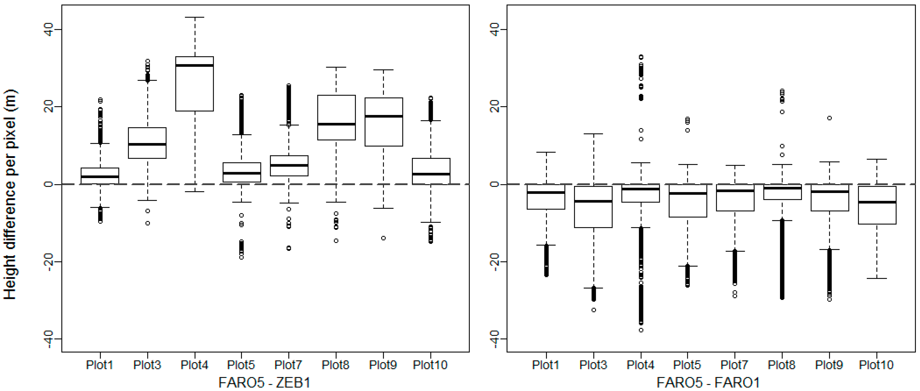 By subtracting the DTM rasters between the different scanning methods, no observable bias is noticed, but for plots on a slope (plots 1 and 4), there are local pixel differences when comparing the FARO1 DTM with the FARO5 DTM (Figure 5). These differences are mainly between −1 m and 1 m, with some deviations up to −3.6 m and 3.5 m and outliers up to 12 m (plot 1) or 18 m (plot 4). The DTM differences between FARO1 and FARO5 have much larger variation for the sloping plots (plots 1–5), compared to the flat plots (plots 7–10) (Figure 5). As we do not have the same difference between the DTM of FARO5 and ZEB1, the local DTM divergence of FARO1 would mainly be the result of the scanning setup which engenders large occluded area. Refining parameters (e.g., reducing the resolution from 10 cm to 50 cm) for the DTM generation may reduce these local differences. DTMs generated from FARO5 and ZEB1 are similar with only a slight bias (less than 20 cm) for the DTM difference of plot 4 (Figure 5). The high herbaceous strata in plot 4 may explain this higher variation between FARO5 and ZEB1 DTMs.