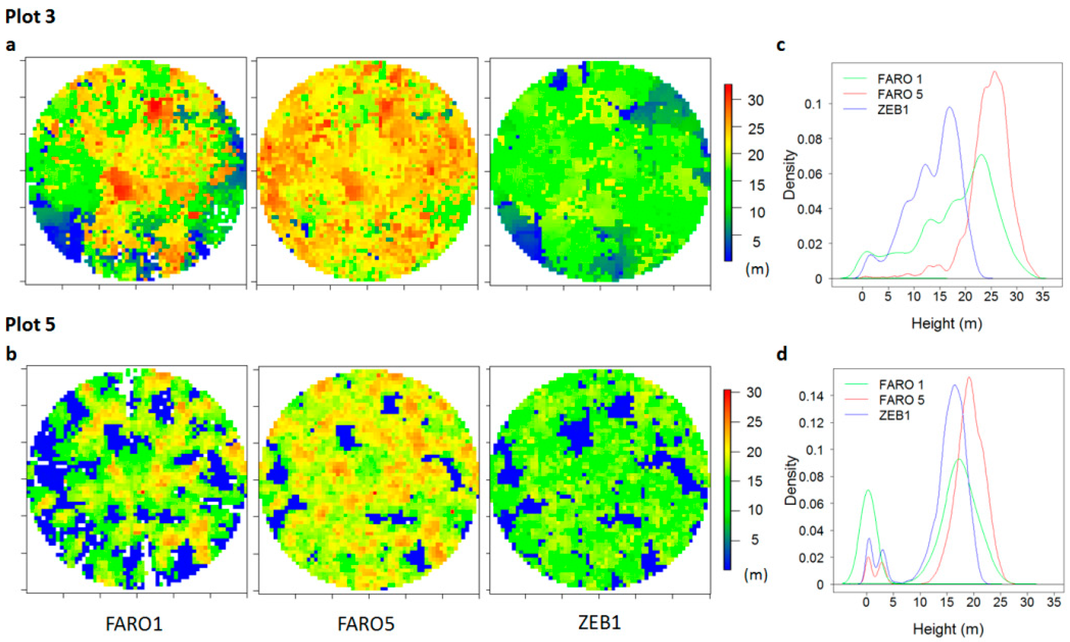 Due to the limited range of the ZEB1, the laser does not reach most of the treetops and the point density in the upper canopy is rather low. A higher proportion of the points are located to the lower height level in the ZEB1 point clouds compare the TLS one. This higher proportion of points in the lower part of the plots with ZEB1 is due to the higher beam divergence of the ZEB1 and to the oscillating movement of the 2D scanner, which is in favor of horizontal scanning.