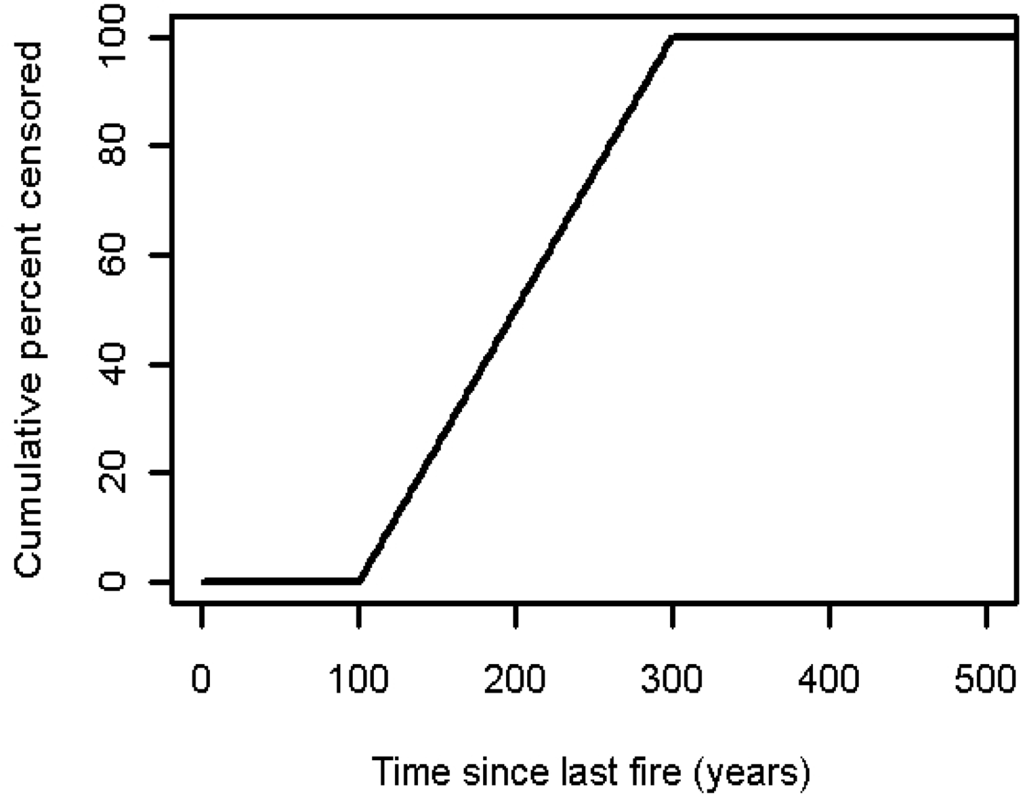 Survival datasets can be described using several interrelated functions. In statistical terms, the three most important are the cumulative density function, the probability density function and the hazard function. Following the terminology used by Johnson and Gutsell [8], who put these functions in the context of stand-replacing fire regimes, the cumulative density function corresponds to the survivorship distribution function A(t), which is the probability of having gone without fire (survived) longer than time t, that is: