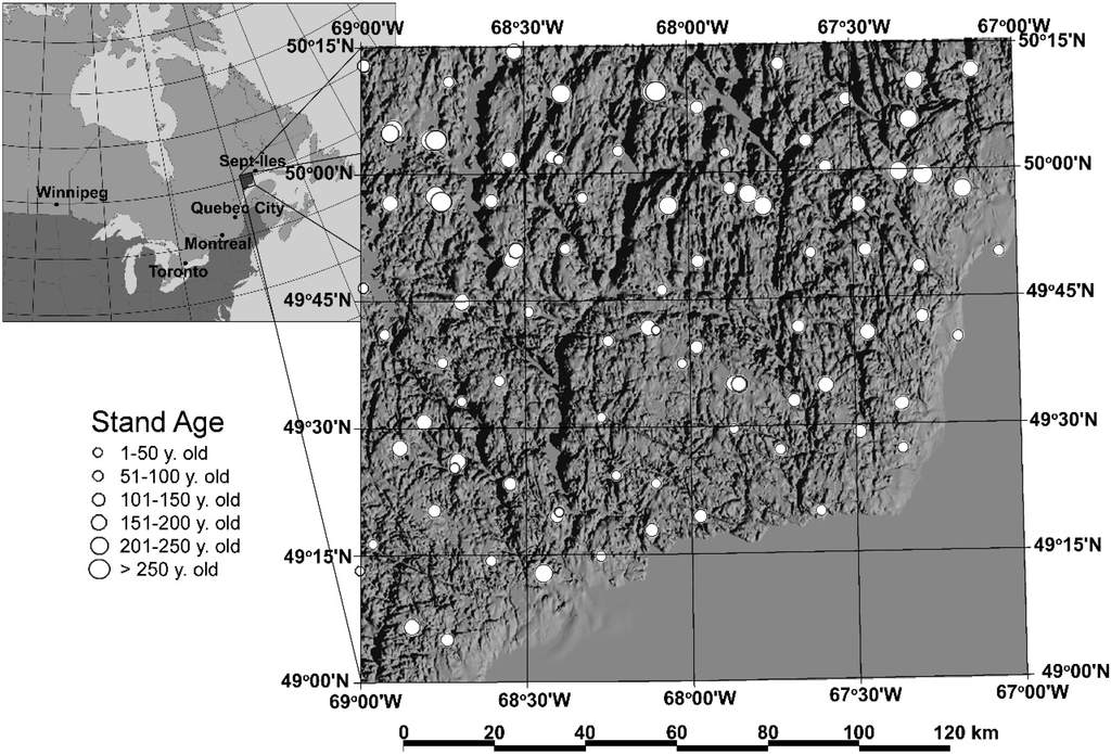 Information from various sources has been used to compile the fire history of this area. All fires affecting a surface area of one or more hectares that have occurred since 1941 are listed in Quebec’s Ministère des Forêts, de la Faune et des Parcs’s archives (MFFPQ-Direction de l'environnement et de la protection des forêts), and aerial photographs dating back to 1931–1932 were interpreted in order to map two older fires (1923 and 1896). In some areas, dendroecological surveys conducted for decadal forest inventories of the MFFPQ were used to assess the amount of time elapsed since the most recent fires. In order to take full advantage of these available data and focus our efforts on ground sampling in areas where the fire history was less known, a preliminary TSF map of the area was created. This rough demarcation included recently mapped fires and sections of the study area covered mainly by even-aged forests of black spruce, which were determined with the help of dendroecological surveys carried out during the MFFPQ’s forest inventory campaigns.