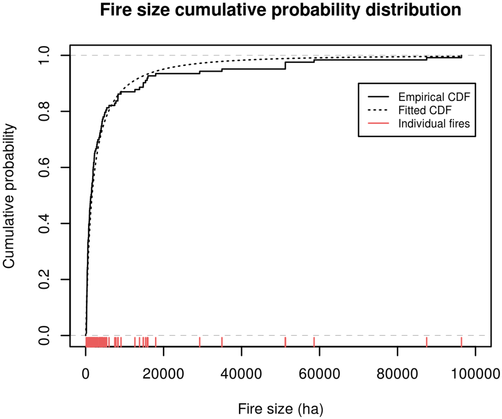 Empirical and fitted cumulative fire size probability distribution (n = 123).