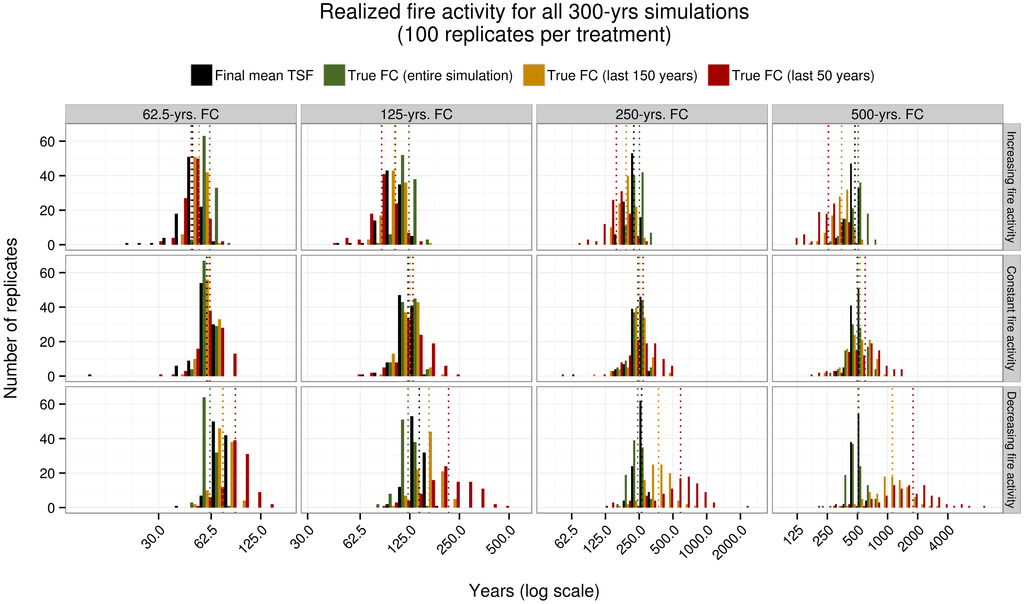 Generally, mean TSF roughly equals the length of the FC when the fire regime is constant. Alternatively, the shorter the FC is, the more mean TSF is linked to recent fire activity, i.e., increasing or decreasing trends in fire activity will affect the age of the simulated mosaic in a similar fashion. Moreover, the link between recent fire activity and mean TSF will be stronger when the length of the FC is shorter. A given landscape can be made drastically younger by more frequent large fires whatever its age previous to the burn, and while it can only get older one year at a time, one year is proportionally more important in younger landscapes, all of which is reflected in Figure 4.