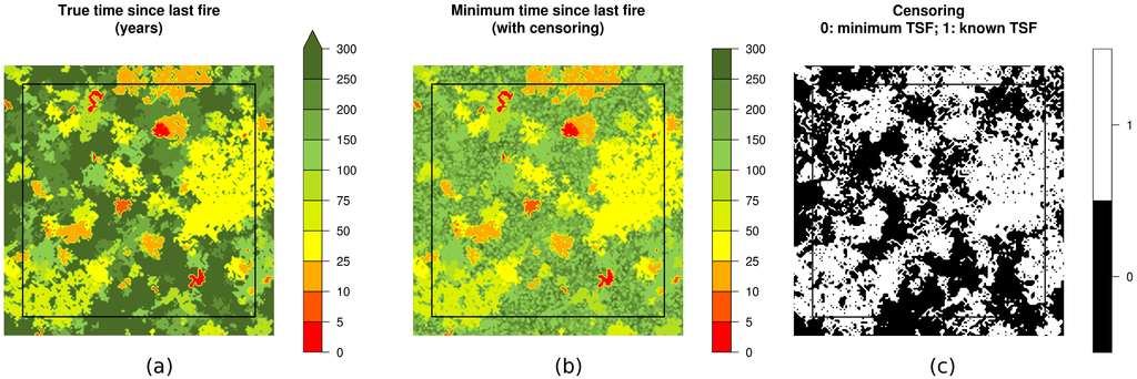 Example of a simulated landscape subject to a constant fire regime of 250 years: (a) true TSF at time t = 300; (b) minimum TSF at time t = 300 after the censoring function was applied; and (c) location of pixels where only a minimum age can be inferred from simulated dendroecological sampling. For all panels, the inner rectangles indicate the region that was subject to simulated samplings. (Patch contours were accentuated for the sake of illustration and may appear to be of an intermediate age. This does not reflect the true TSF values that were considered in our simulations.)