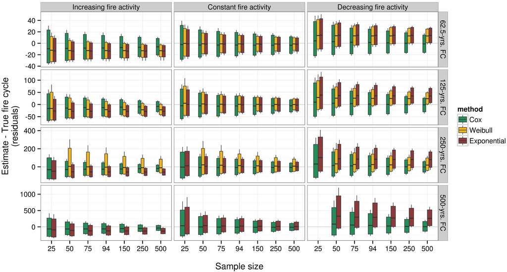 To assess the accuracy of each survival-based method of estimation, we first recorded the exact true FC over the course of the entire 300 years, which varied around the target FC because of the stochasticity of the fire series drawn. Then, we computed the three survival-based estimates (Cox, Weibull and Exponential) with varying sampling efforts. By analyzing how the residuals (estimated minus true value) were distributed as a function of the fire regimes simulated and the sampling effort, we produced a first general assessment of the accuracy and precision of each method and its relative sensitivity to the conditions under which estimates were obtained.