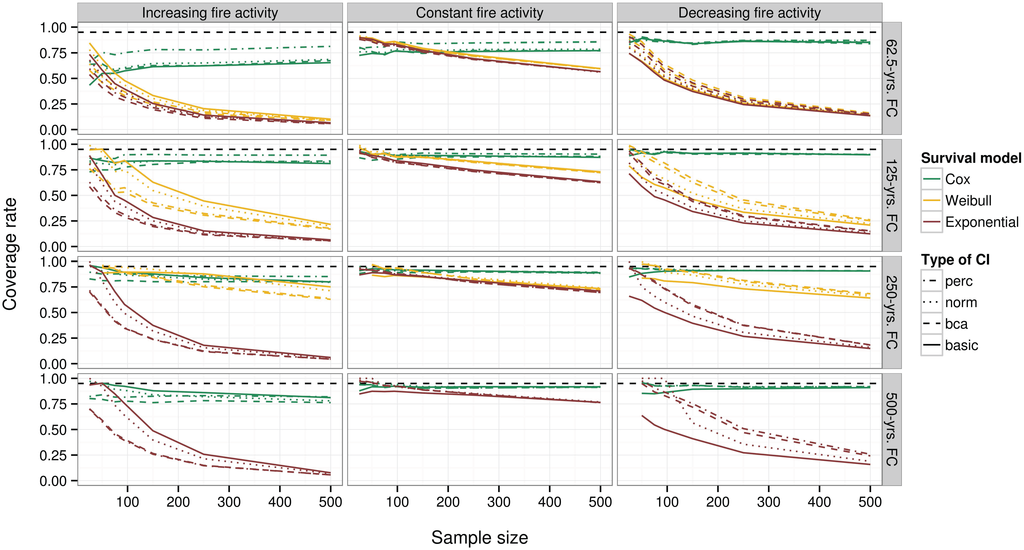 When estimating FC in a context of increasing or decreasing fire activity, all types of confidence intervals perform very badly when based on parametric survival models (exponential or Weibull), mainly because of the considerable biases that are associated with those methods. The CI95 associated with the estimates obtained using Cox regressions actually are the only ones that behave in a consistent manner when increasing the sampling effort or under different temporal patterns of fire regimes.