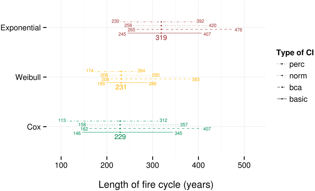 Regardless of the method used, it is important to highlight the fact that a wide confidence interval must be associated with estimates of FC for the last 300 years. In many cases, the type of bootstrap CI95 does not seem to make any difference in terms of their coverage performance. However, here we suggest the use of the bias-corrected and accelerated bootstrap CI95 (BCa) for the following reasons: (1) the estimate bootstrap distribution is moderately biased and skewed toward higher values (data not shown), which corresponds exactly to the situation for which BCa bootstrapping has been developed in the first place [54]; and (2) all other methods, i.e., basic, percentile and normal approximation bootstrap CI, have been shown not to perform well in those types of situation, especially the percentile bootstrap, which, by inverting the lower and higher percentiles in the calculation of the confidence interval [43] may create artifacts such as the considerably lower limit produced from the present case study. For all three of those methods, biased and skewed bootstrap distribution may cause confidence interval coverage to be lower than the nominal value. We have not investigated why some of those latter types of confidence interval seem to perform better when the landscape being analyzed has been subject to an increase in fire activity, but we suspect this may be caused by some fortuitously convenient bias similar to that related to the surprisingly good performance of Weibull under very specific conditions that cannot a priori be assumed with empirical data.