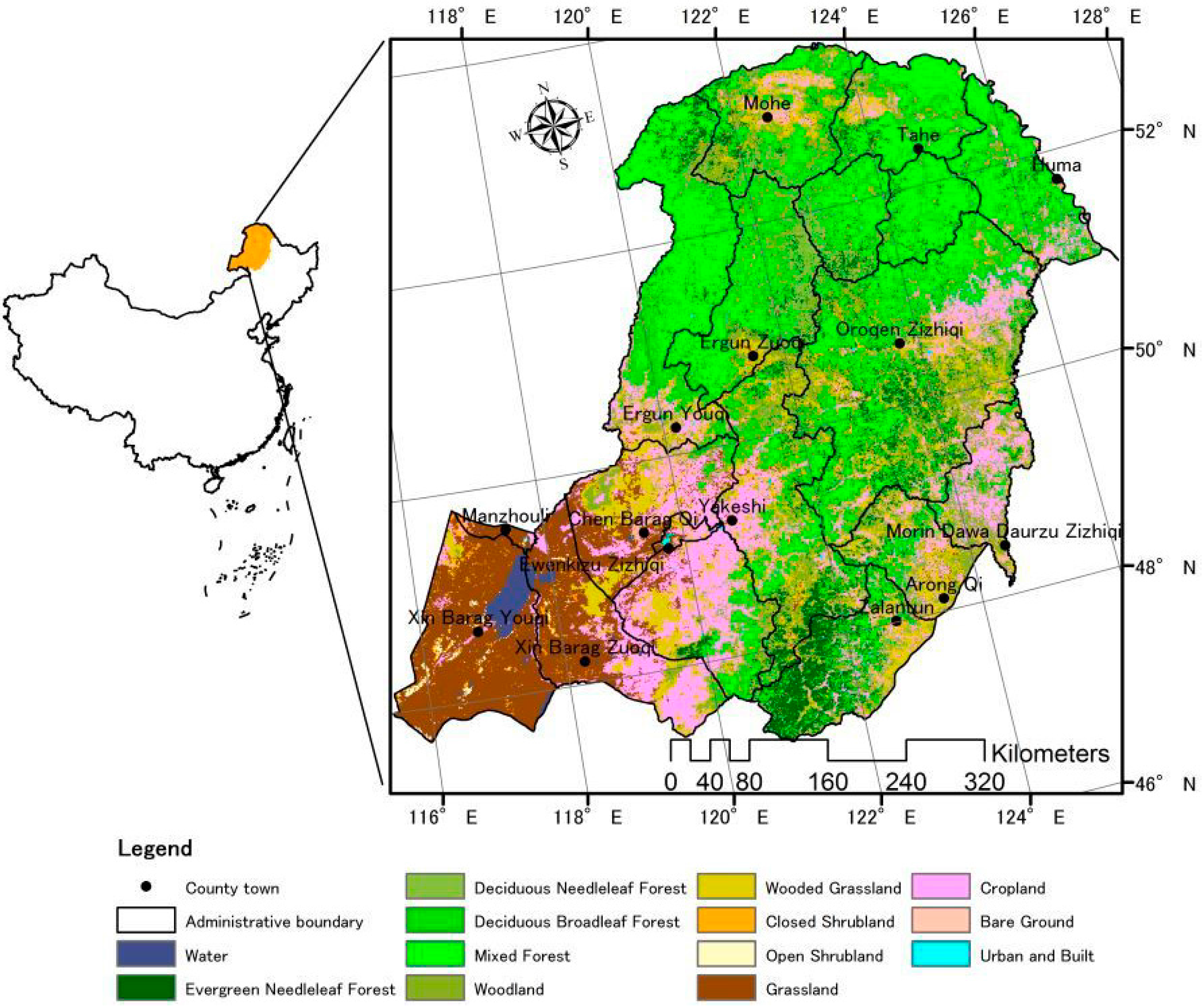 The species composition is relatively simple, and the forest area covers over 75% of the study area. The most dominant tree species is larch, which accounts for 80% of the study area. The second most dominant species is birch, which covers 10% of the study area. Other species, including pine, spruce, aspen and willow cover approximately 10% of the study area. Figure 1 show the land cover distribution in the study area, which was acquired from the Advanced Very High Resolution Radiometer (AVHRR) Global Land Cover Map (http://www.glcf.umd.edu/data/landcover).