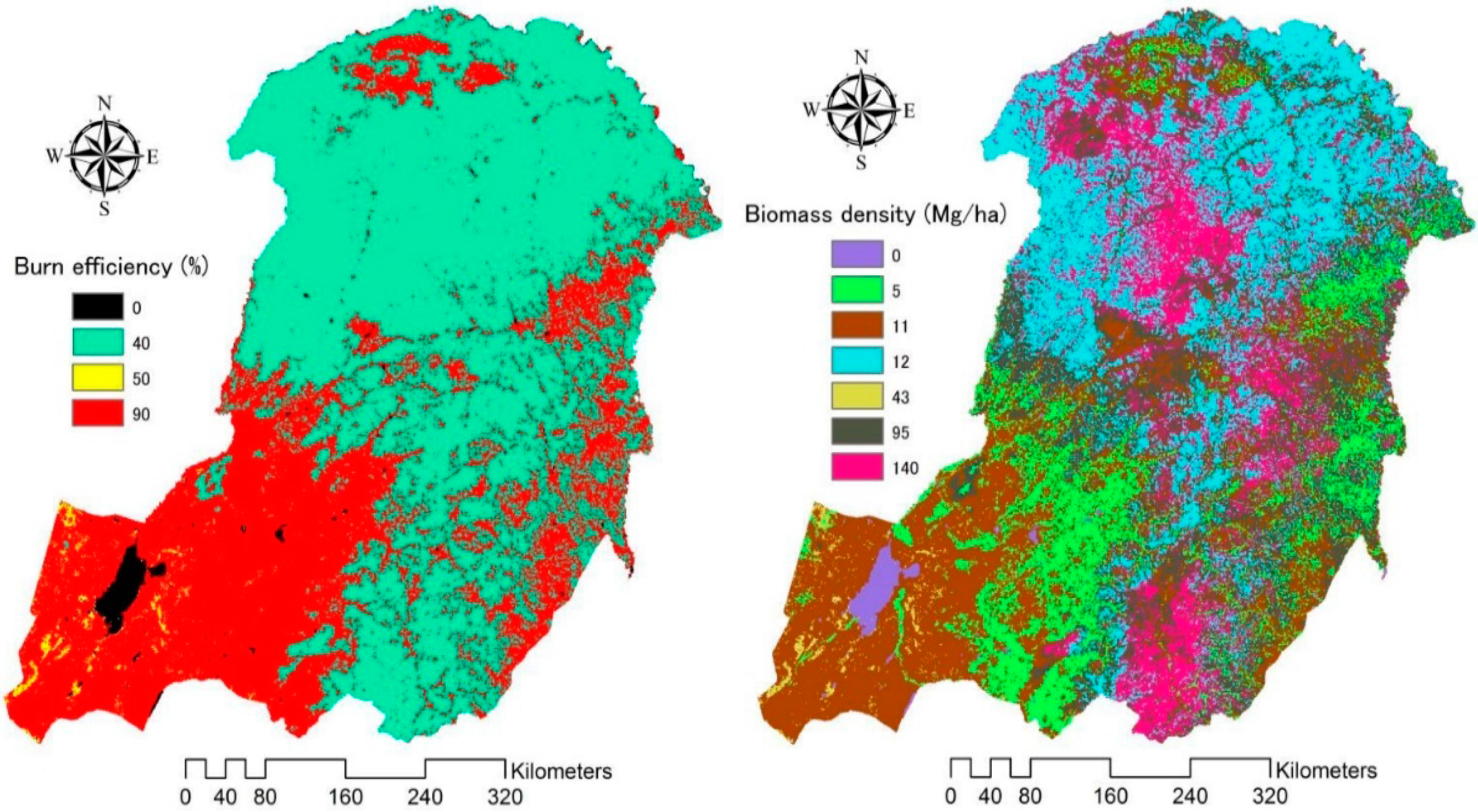 Biomass density (left) and burned efficiency (right) distribution in the study.