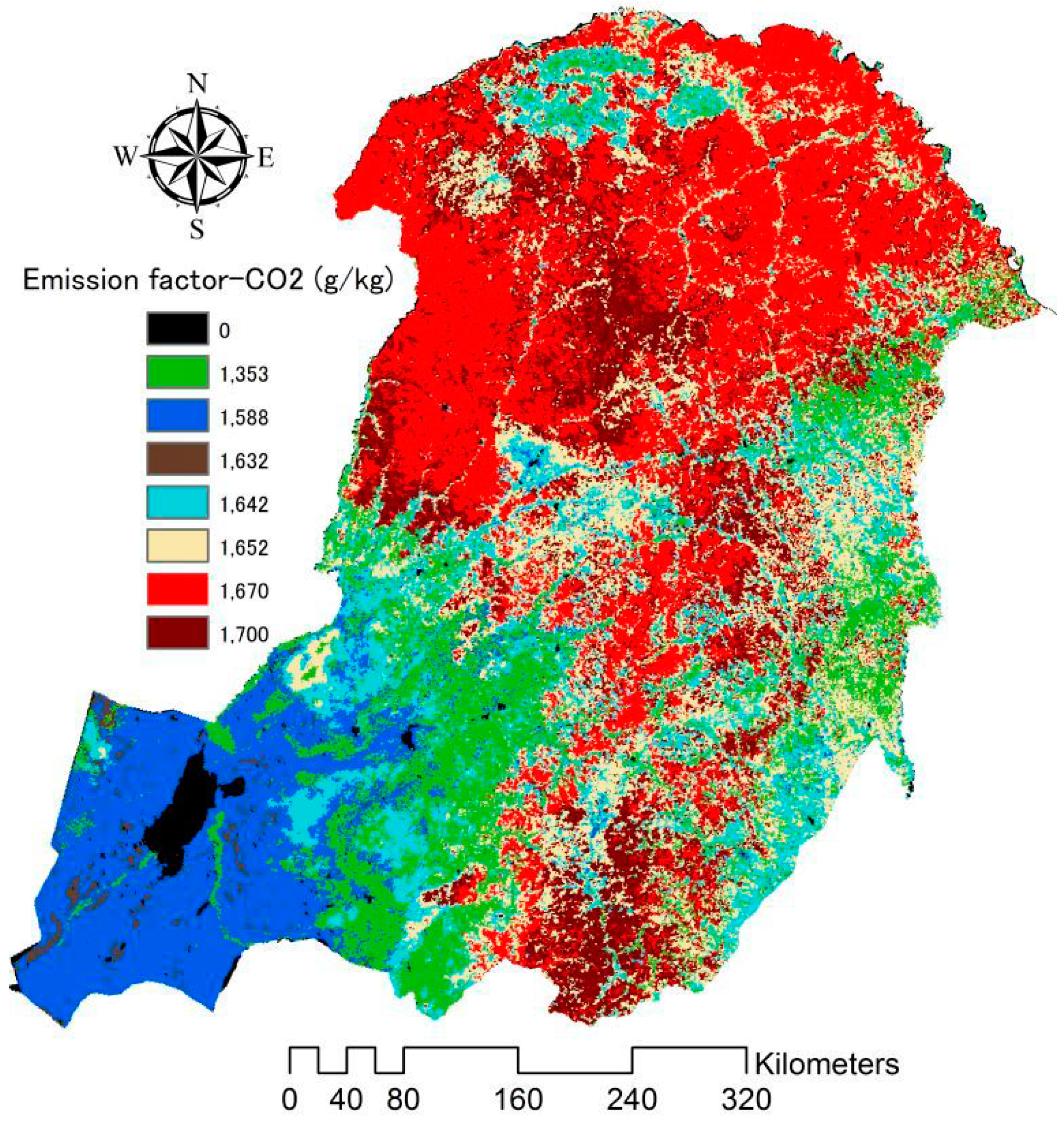 Emission factors, usually defined as the amount of certain trace gas and aerosol species released per amount of fuel consumed, which are expressed in grams of a gas compound per kilogram of dry matter [26,43]. Emission factors are based on the correlation between the concentration of a certain gas species and the concentration of the reference species emitted and are estimated from experiments for specific conditions [26]. Emission factors for various ecosystems and environmental conditions have been derived either in natural conditions or in controlled laboratory experiments [7,41,42] where the rest of the variables were known (i.e., the amount of the compound released, the amount of fuel burned and the concentration of the element in the fuel) [26]. In the present study, emission factors were also assigned for each land cover classification in the AVHRR GLC-2000 data. These emission factors for each emitted species, which are given in Table 2, were based on previously published studies [7,42]. The average of relevant emission factors for each gaseous or particulate species was applied when more than one emission factor was available in the literature. Figure 4 shows the determination of CO2 emission factors in China. The emission factors of other emitted species (CH4, CO, PM10, PM2.5, SO2, BC and NOx) were also determined in the same way.