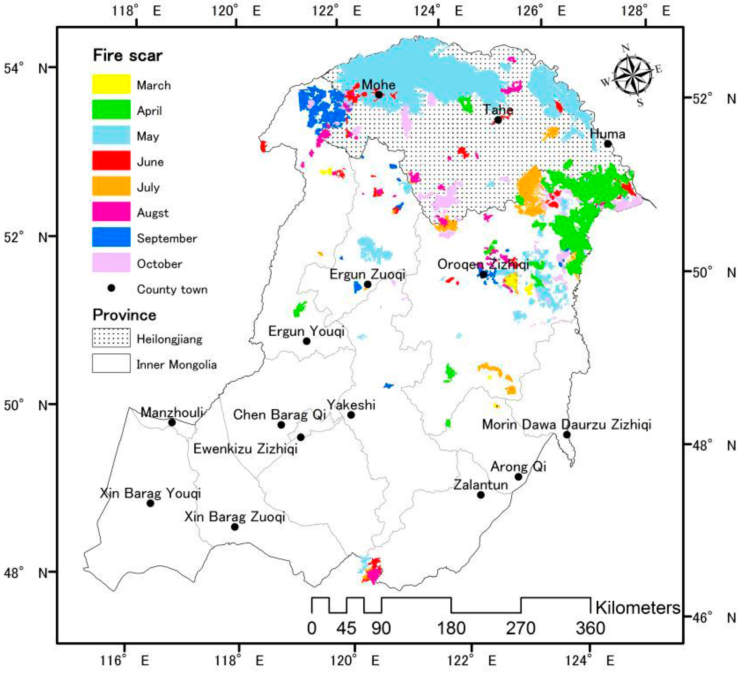 Spring and autumn are two primary fire seasons in the GXM. Almost 80% burned area are burned in three months (May: 52%; April: 15%; October: 12%). Normally, there are no large fire events due to high precipitation and high fuel moisture in summer (July and August) and to low temperatures accompanied by the accumulation of snow and frozen land in winter (late November to February) (Figure 6). Thus, fire events occur in spring from mid-March to mid-June and from mid-September to mid-November in fall. Large fires occurred more often in the northern region of the GXM between 50° N and 54° N latitude than in the southern region (part of Inner Mongolia Province) (Figure 5) due to much drier weather and higher fire danger in the northern region (part of Heilongjiang Province). The vegetation in this region is a cold-temperature mixed coniferous forest, in which fire is likely to occur. Burn scars and the associated vegetation succession lead to a mosaic of landscape patches. These spatial patterns of regenerating vegetation in various succession stages are important considerations for carbon budget studies in boreal forests [45].