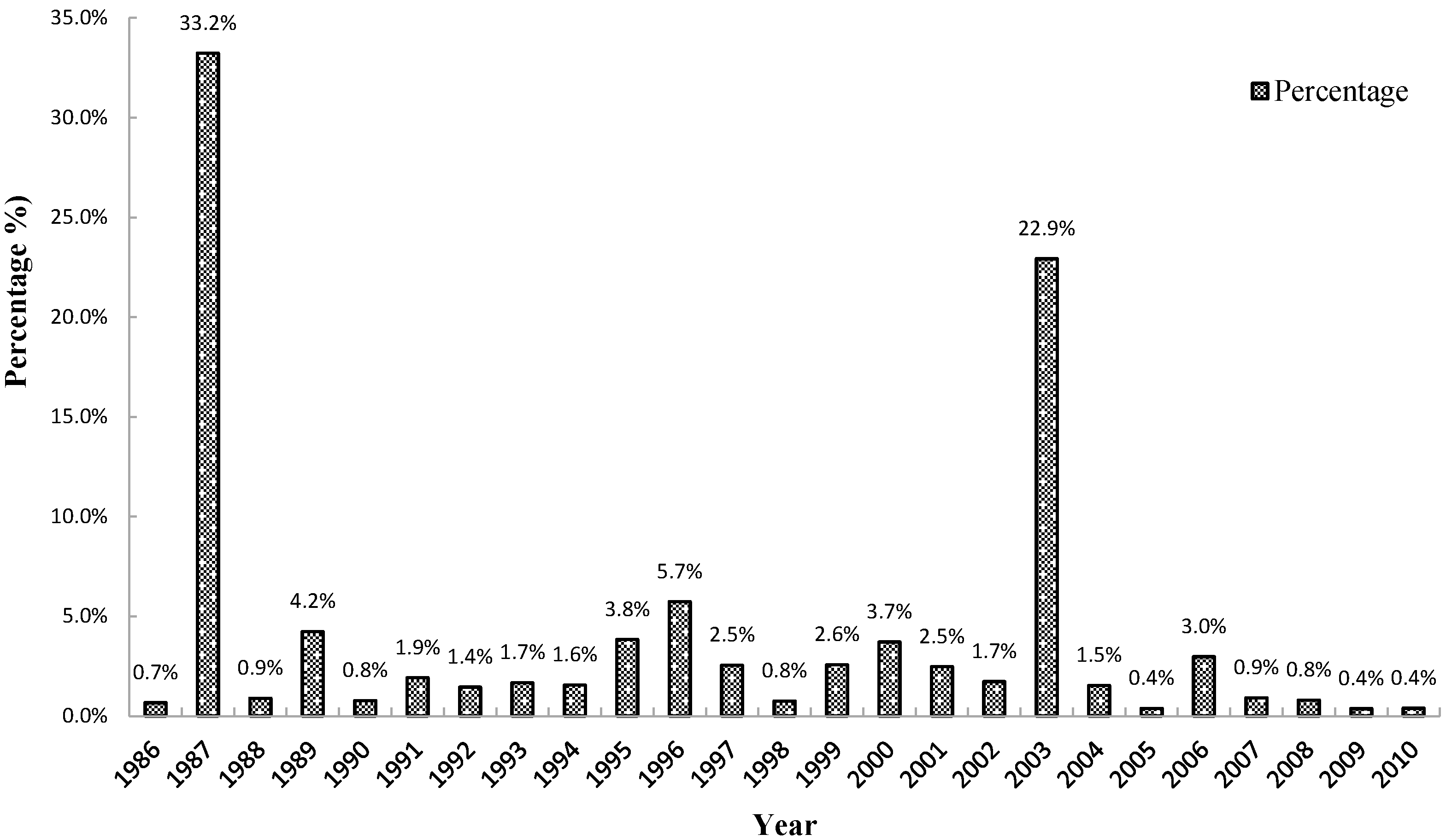 Figure 7 shows the burned area shift from 1986 to 2010. The years 1987 and 2003 contributed 33.2% and 22.9%, respectively, in burned area during the 25 years. In total, 1.53 million hectares were charred by fires in 1987, which was the most destructive fire year in China’s history, with a specific larger fire in May that burned 1.33 million hectares alone. Extreme meteorological conditions, in combination with the lack of accessibility, resulted in large, high-intensity crown fires throughout China’s boreal forests in 1987 [44]. Snowfall over the northern China was typically light during the winter of 1986–1987, and the snow cover had disappeared by early April southeast of Lake Baikal and along the Amur River. Low temperatures and relative humidity prevailed throughout April, with only a light scattering of precipitation. The cumulative result was an extremely dry forest fuel situation in this region by the beginning of May 1987, which combined with increasing temperatures and strong winds to produce uncontrollable forest fires. Another severe fire year in the history is 2003, during which approximately 1.1 million hectares was burned. Dozens of fires burned in the GXM region from Inner Mongolia to Heilongjiang Province in May 2003. As the neighbor of the GXM, West Siberia’s largest forest fires on record also occurred during the same period in 2003, claiming approximately 20 million hectares of land and emitting heat-trapping emissions equal to the total cuts in emissions that the European Union pledged under the Kyoto Protocol [46]. Higher temperatures and thawing permafrost are most likely contributing to the rising frequency and severity of forest fires in West Siberia [47].