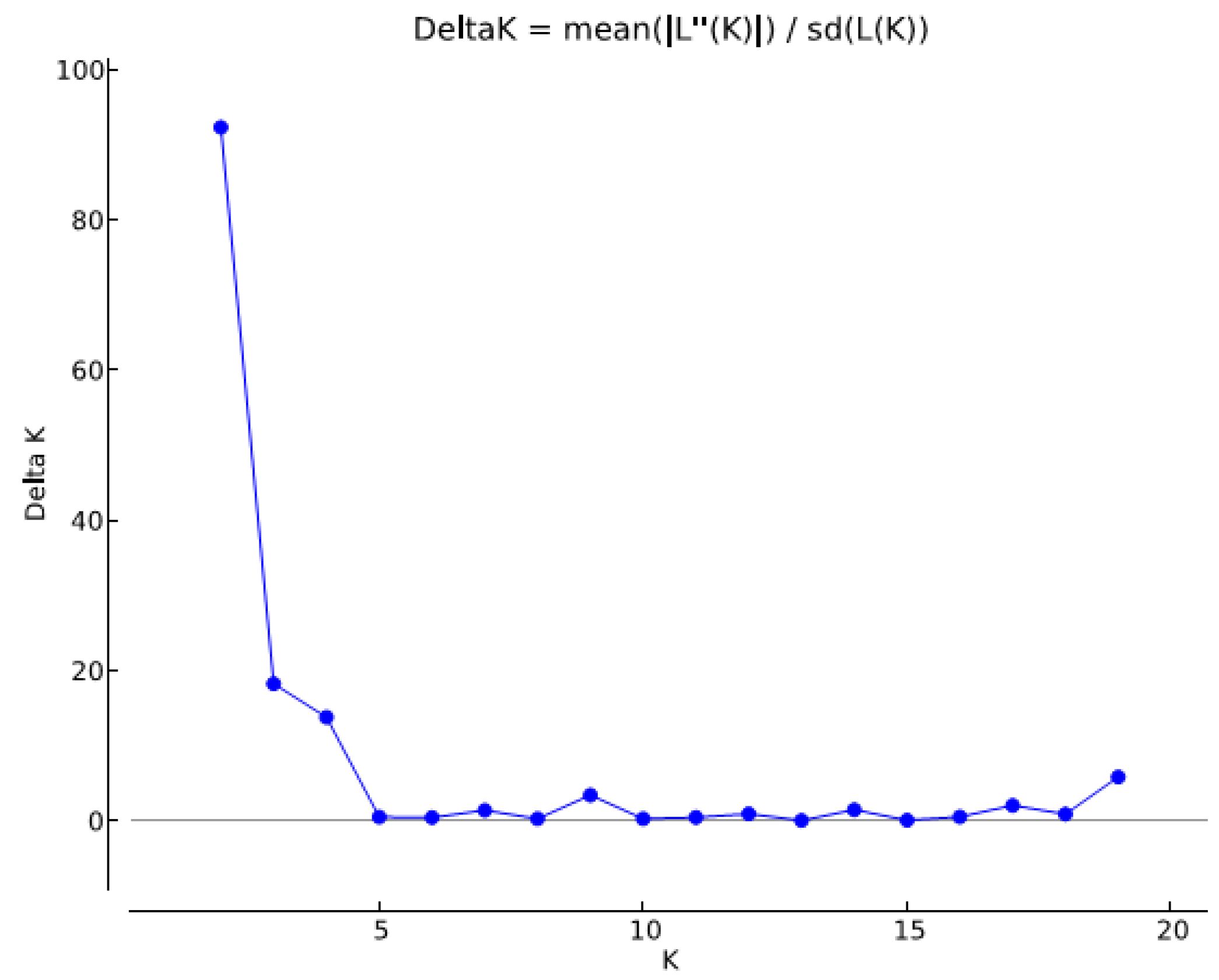 - Evanno, G.; Regnaut, S.; Goudet, J. Detecting the number of clusters of individuals using the software structure: A simulation study. Mol. Ecol. 2005, 14, 2611–2620. [Google Scholar] [CrossRef] [PubMed]