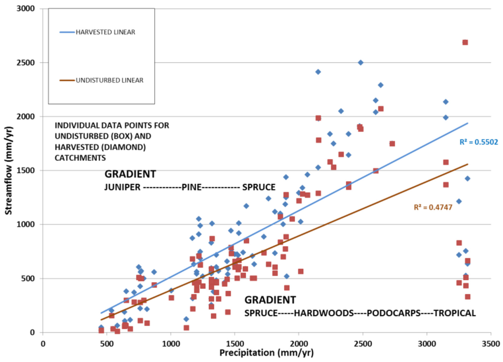 First year streamflow responses to forest harvesting by precipitation amount, 450 to 1200 mm precipitation, forest ecosystems in Europe, North America, Australia, and Japan. Adapted from [20].