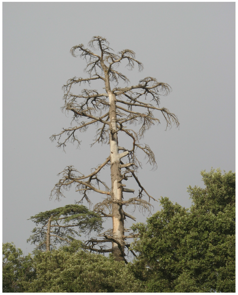 Decline symptoms observed in Atlas cedar (Cedrus atlantica) forests from Middle Atlas (North Morocco, Photo from V. Lechuga). (Note that Quercus ilex is the broadleaf species that replaces Atlas cedar following mortality of canopy trees).