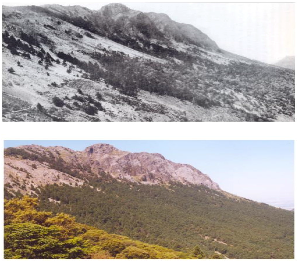 Photographs from 1929 (upper figure, photograph taken from Barbey, 1931) and 2003 (lower figure; Photo from J.C. Linares) at south Spain (Sierra de Grazalema) showing changes in A. pinsapo forest coverage following land use changes following A. pinsapo forest conservation.