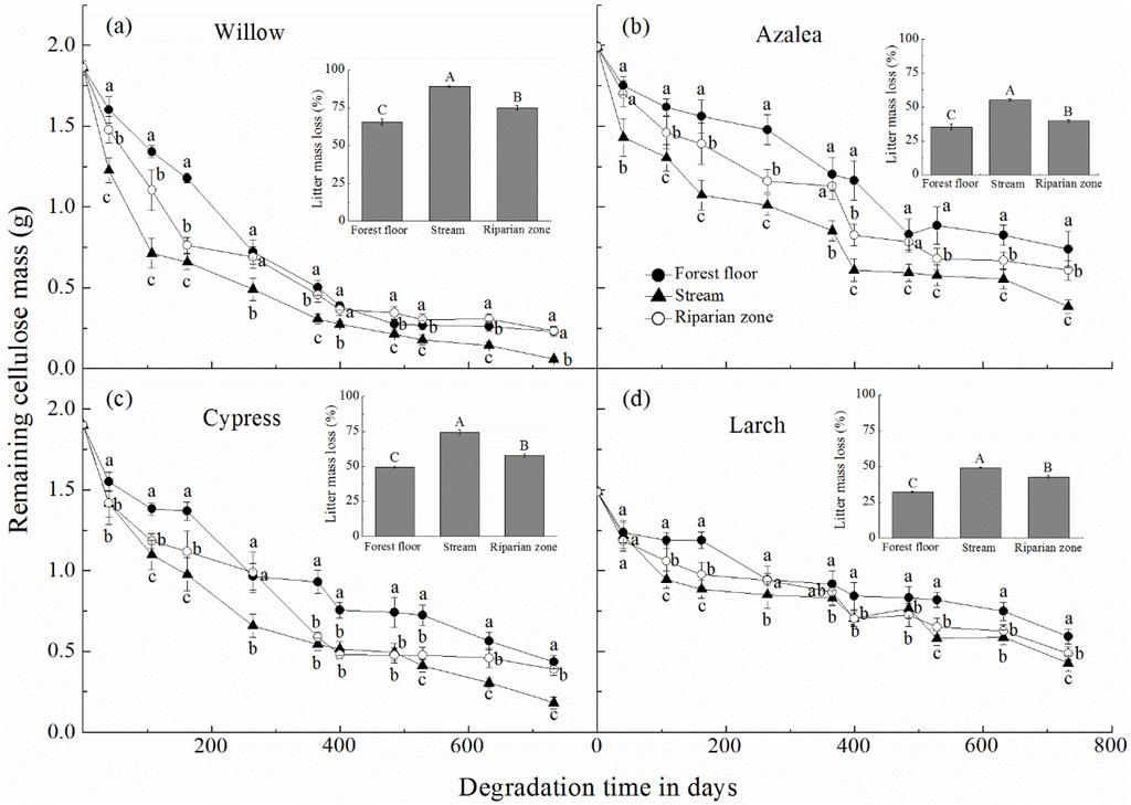 To do so, a two-year field litter decomposition experiment was conducted in an alpine forest meta-ecosystem on the eastern Tibetan Plateau, where large amounts of plant litter accumulate and frequent freeze-thaw events are common in winter [25]. We measured the remaining cellulose masses, cellulose concentrations, and degradation rates in the decomposing foliar litters of four species, which differed widely in initial chemical traits, from the dominant species of willow (Salix paraplesia), azalea (Rhododendron lapponicum), cypress (Sabina saltuaria), and larch (Larix mastersiana) incubated in forest floors, streams, and riparian zones. We hypothesized that (1) cellulose is degraded at varying rates in different ecosystems in the order of streams > riparian > forest floor; and (2) the degradation rate of cellulose will be controlled by the same hierarchy of factors (i.e., litter species and local-scale environmental factors) across ecosystem types.