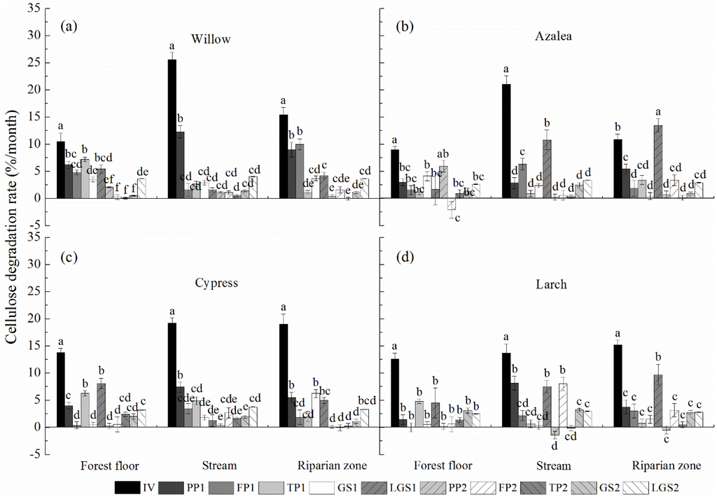 Dynamics of cellulose degradation rate (percent initial mass per month, %/month) in decomposing foliar litter of (a) willow; (b) azalea; (c) cypress; and (d) larch in different ecosystem types during the two-year experiment (mean ± SD, n = 9). Different lowercase letters indicate statistically significant (p < 0.05) differences of cellulose degradation rate among different decomposition periods for a given litter species in a specific type of ecosystem. IV: initial value; PP: pre-freezing period; FP: freezing period; TP: thawing period; GS: growing season; LGS: late growing season; 1: the first year; 2: the second year.