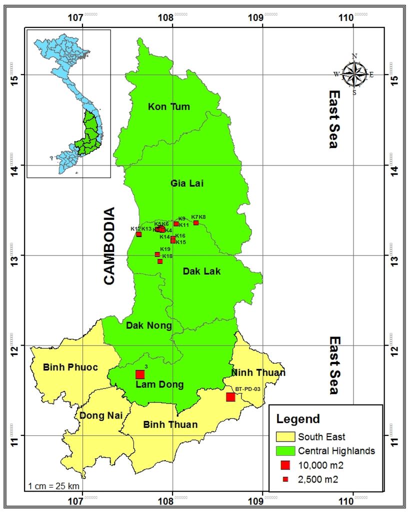 The data for this study were collected in two of the eight agro-ecological zones or ecoregions of Vietnam [5,8]: CH and SE. (Binh Thuan Province). The ecoregion classification accounts for environmental variability with respect to climate, soil, and altitude, and is therefore relevant to forest stratification. Most of the country’s dipterocarp forests exist within the CH and SE ecoregions. Figure 1 shows the location of sample plots of dipterocarps of two agro-ecological zones.