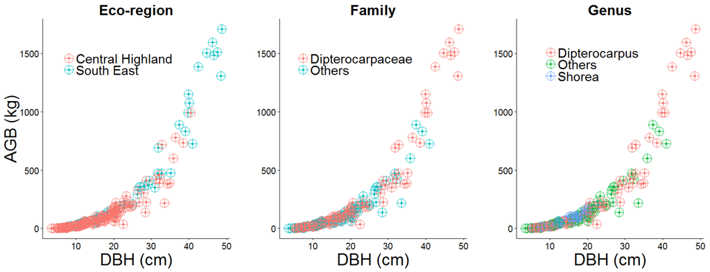 Equations were developed at two levels: mixed-species (all trees) and dominant genera of the dipterocarps (Dipterocarpus and Shorea). Exploratory analysis of destructively sampled tree data by ecoregion, family, and genus suggested the use of a power model with random effects (Figure 2).
