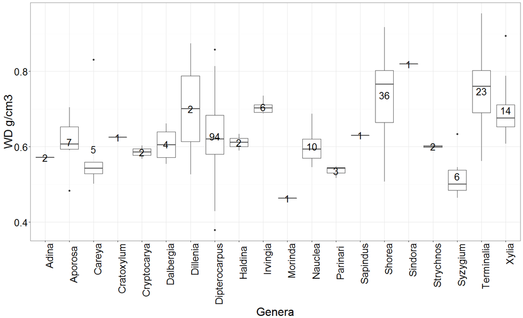 Box plot of WD by sampled genera in alphabetical order. Numbers inside the boxplots represent the sample size in that genus.
