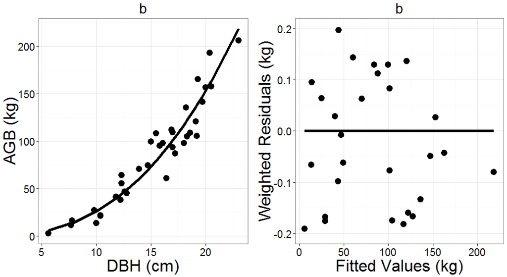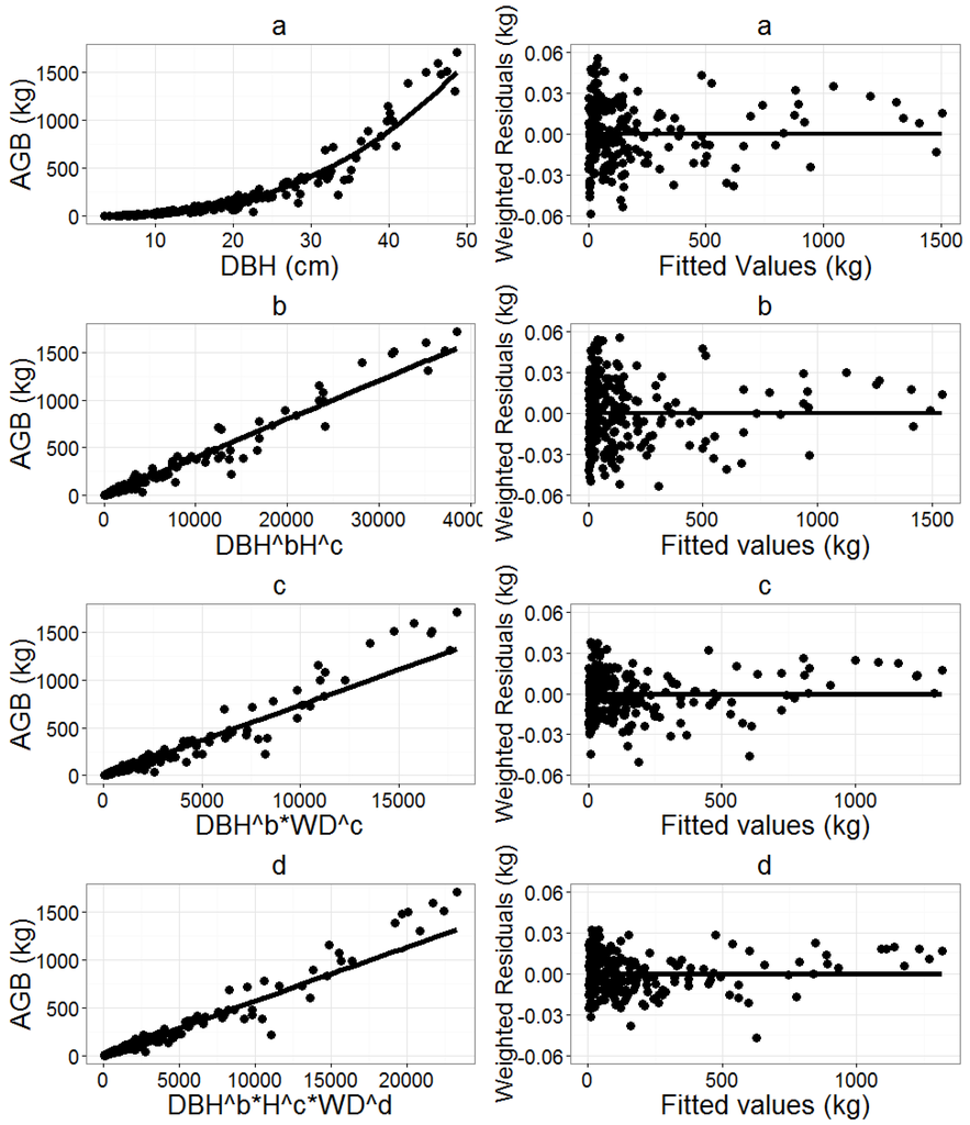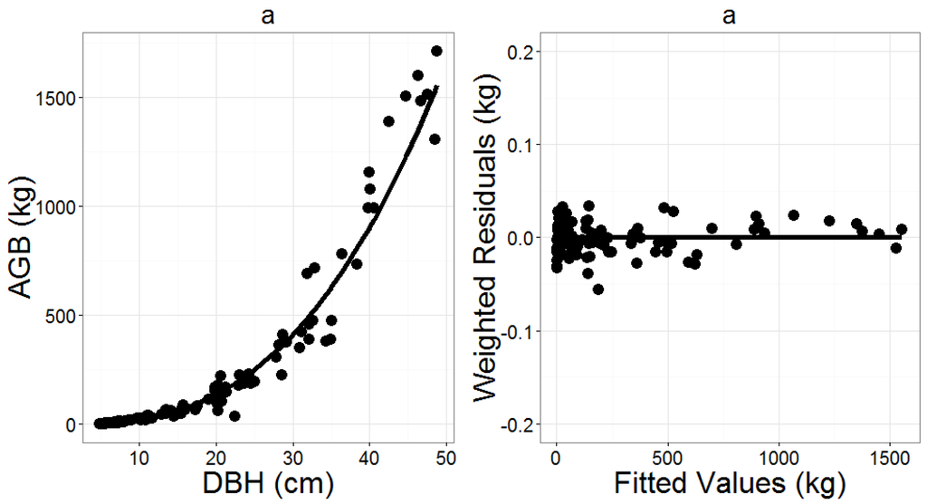 Preliminary analysis also indicated that heterogeneous variance of residuals existed in all AGB models, as the variance tended to increase with increasing diameters. A power variance function as defined in Equation (5) was used to take into account the heterogeneity of residuals.