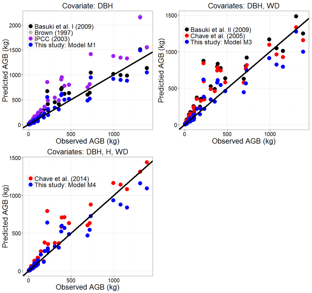 Aboveground tree biomass is known to be affected by tree diameter, height, and wood density; diameter and height yield volume with wood density act as a scaling factor for biomass. The mixed-species equations available in this region have used different explanatory variables to estimate aboveground biomass e.g., [12,13,16,17,19]. For modeling AGB in mixed-species dipterocarp forests, we found that an equation with DBH as the only covariate performed poorly (highest AIC) when compared to equations that also incorporated H, WD, or both H and WD variables. Furthermore, the mixed-species equation developed in this study that incorporated all three variables resulted in the lowest uncertainty and lowest AIC. This could be due to the fact that at the mixed-species level, the wood density component helps in adjusting for the differences in allometric relationship between DBH and H among species. Thus, the best option for mixed-species was the AGB equation with three variables, DBH, H, and WD, in the form of M4. We would like to point out the use of height in fitting biomass equations. Commonly, the height measured after felling the sample trees is used in model development but the standing tree heights are used in applying these equations. This discrepancy in the variable used in model fitting and application can result in biased estimate of the AGB and the magnitude of bias depends on the sign and magnitude of bias in height measurement as well as the model form and coefficients.