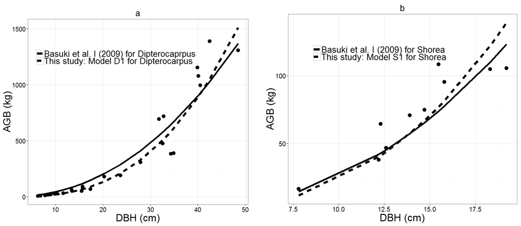 However, as increasing the number of input variables from one (DBH) to three (DBH, H, and WD) did not improve model fit for either genus, the following simple AGB models with DBH as the only independent variable were selected for Dipterocarpus and Shorea, respectively.