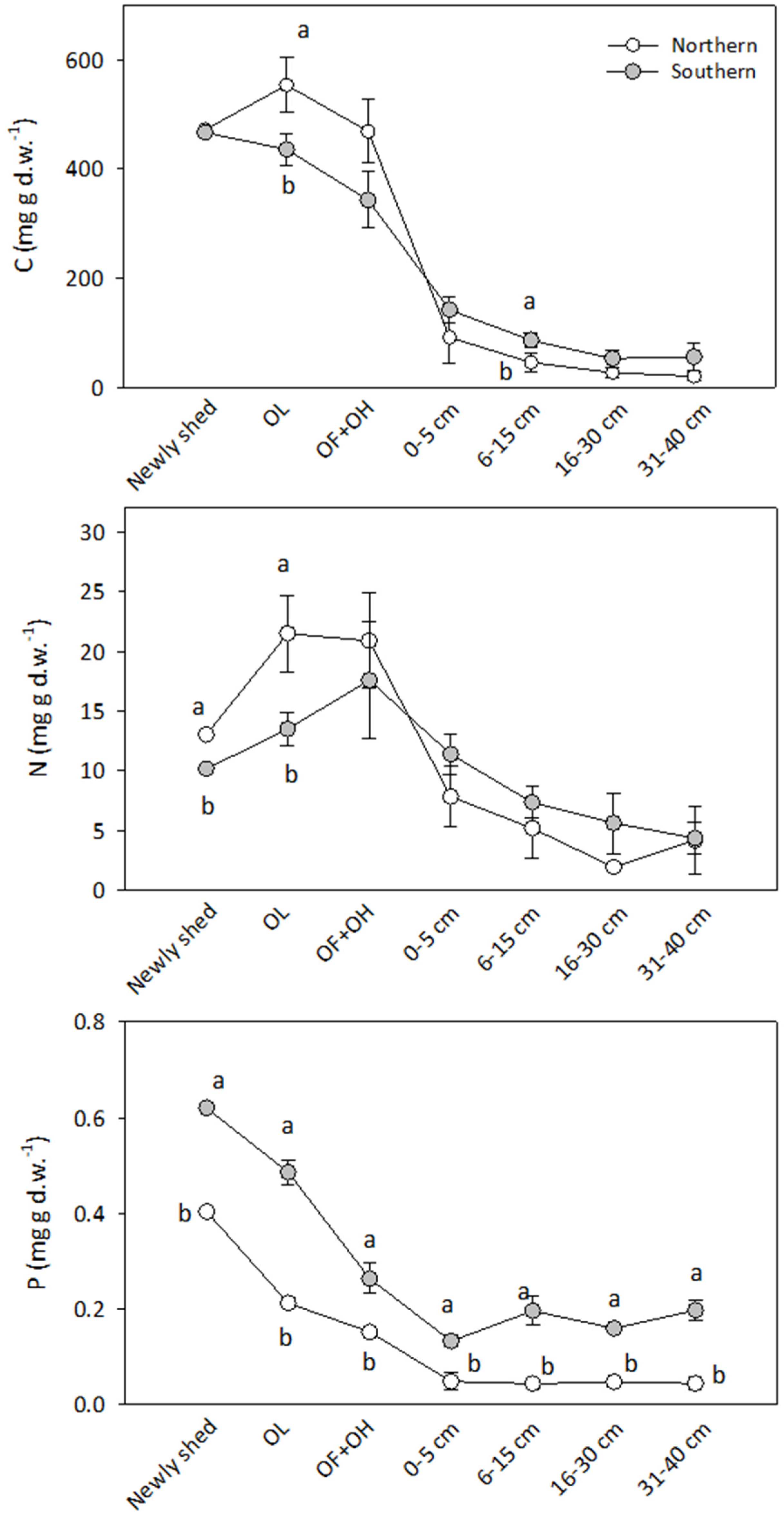 In both sites, C and N concentrations typically declined with soil depth (Figure 1). In contrast with forest floor, soil N concentration was higher at the southern site (Table 1 and Table 2; Figure 1). As expected, the C/N ratio declined with depth in both sites (Supplementary Materials Figure S1).