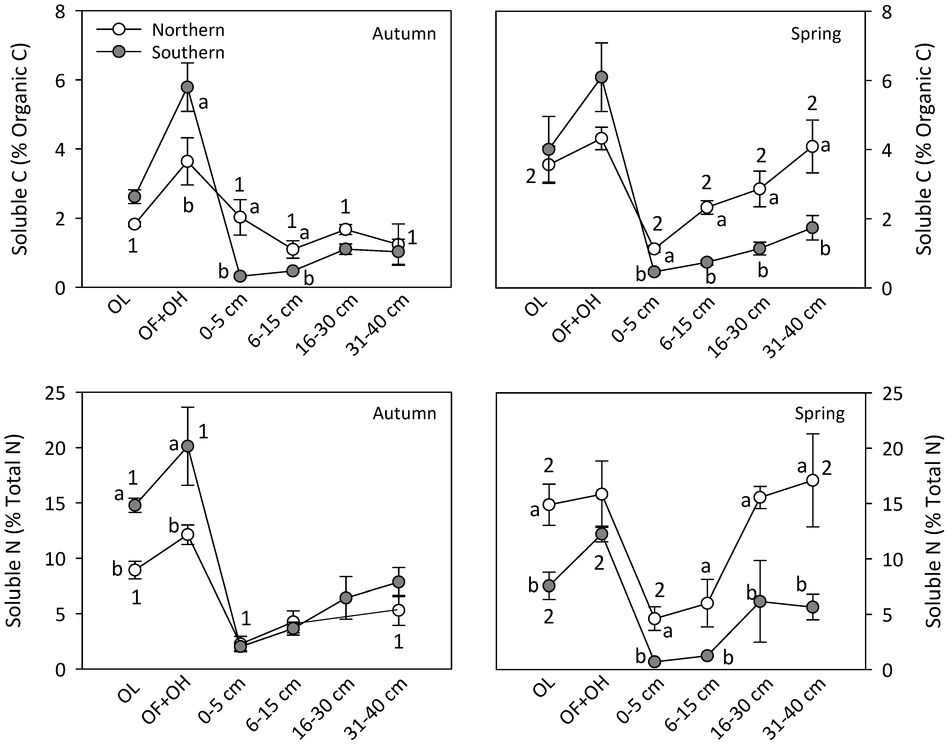 Soluble C and N fractions % of total C and N in the continuum forest floor -mineral soil of a northern and a southern beech forest. Values are means ± standard error; n = 18 samples (6 sampling plots, 3 replicate analyses). Different lower-case letters indicate significant differences between sites; differences between seasons are indicated by different numbers (two-way ANOVA followed by post-hoc Holm-Šídák method; overall significance level = 0.05).