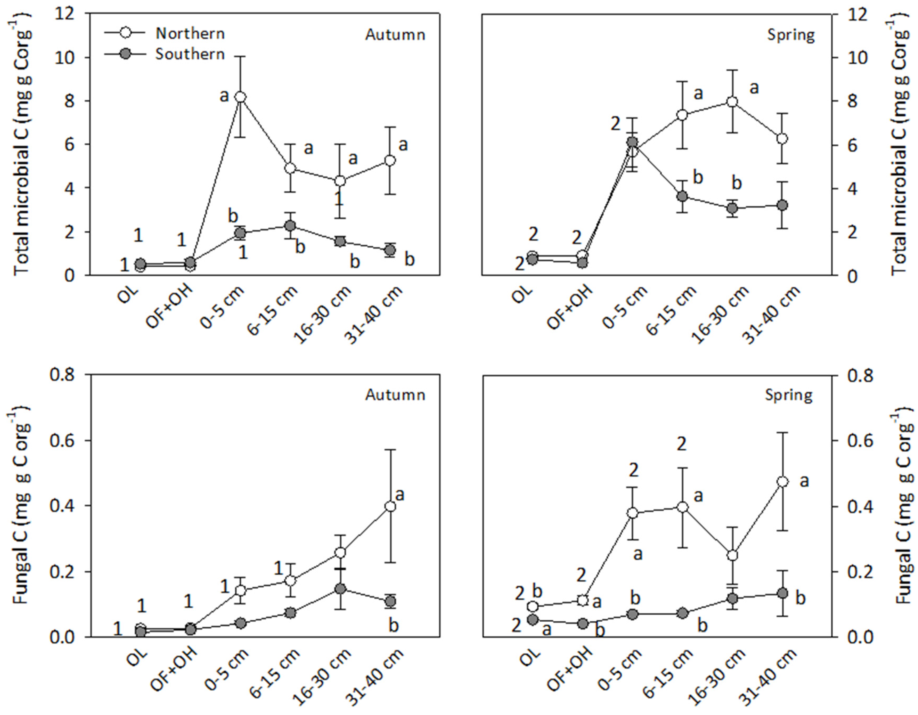 The increase from autumn to spring of soluble C and microbial C fractions down to the whole profile of NF but not of SF suggests a tight control of environmental factors. A previous litterbag-study [59] has showed that, in the field, northern beech litter decomposed more slowly than southern beech litter; however, under stable conditions in microcosms, this trend reversed. More rigid temperatures (mean temperature of the autumn–winter period: 0.7 vs. 3.7 in the southern forest) and freezing prevent decomposition in the northern forest while decomposition in the southern forest slows down but does not stop during the winter months [59]. The differences observed in the present study between autumn and spring data for soluble and microbial C fractions are consistent with the results of Innangi et al. [59], and point to a remarkable sensitivity to temperature of microbial processes in the northern forest.