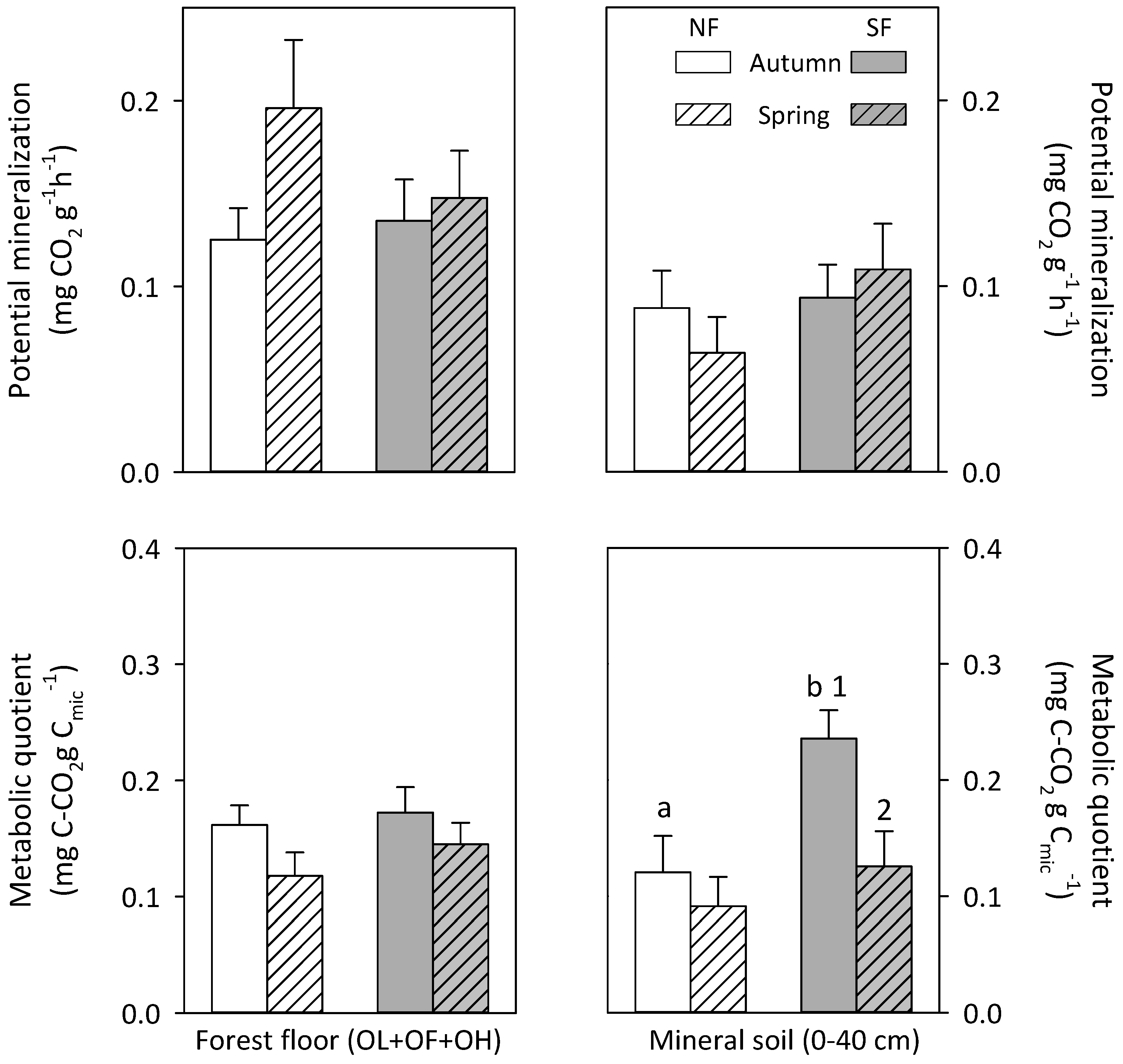 Potential mineralization was similar in the two forests and declined from forest floor to mineral soil (Figure 7). The metabolic quotient was always slightly lower in spring than in autumn and a significant difference was found in autumn between the two forests in mineral soil (Figure 7).