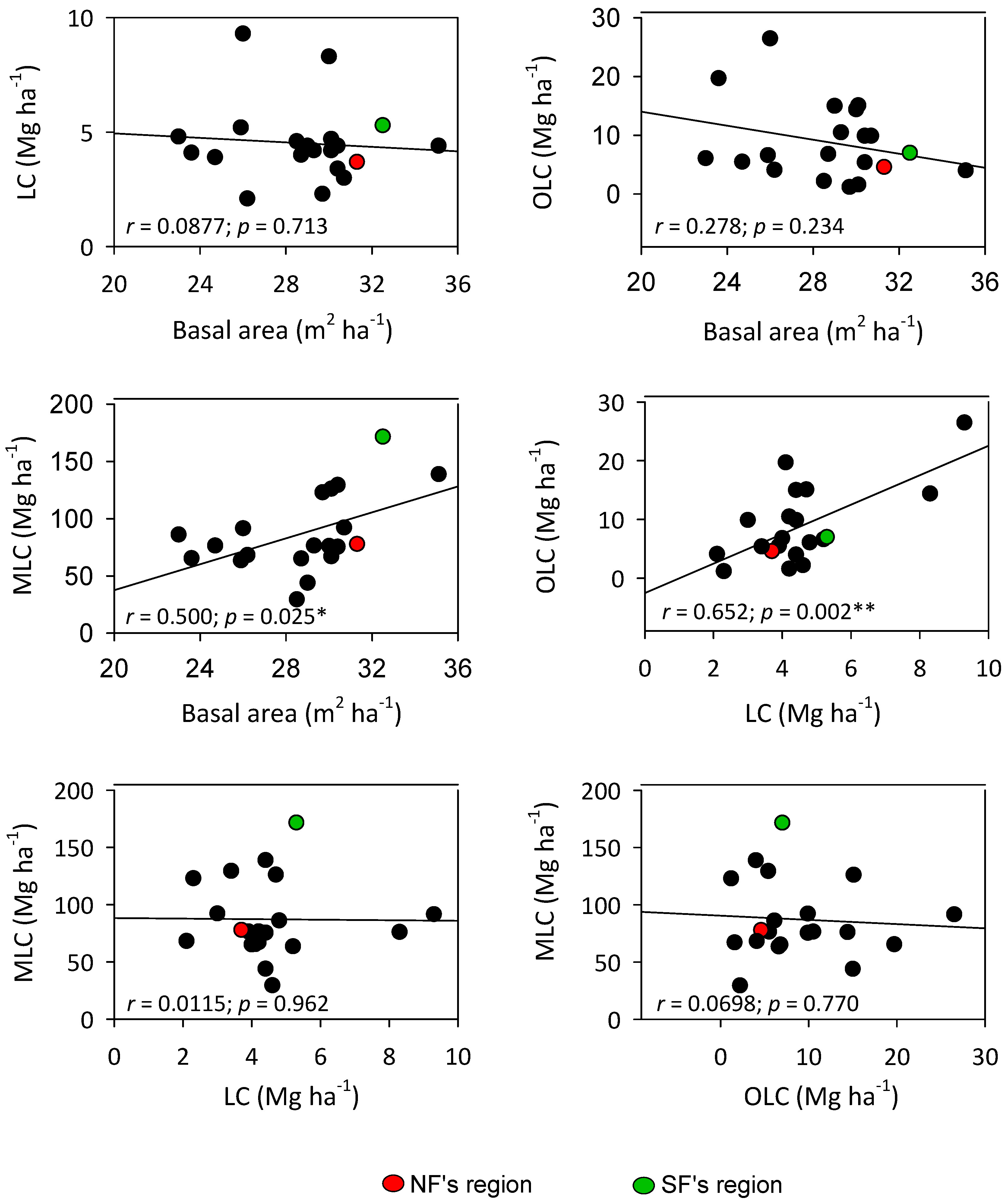 Relationships among C pools in litter (LC), organic layer (OLC) and mineral soil (MLC) and between basal area and C pools in Italian beech forests. Points are mean estimates for the twenty administrative regions, reported in the National Forest Inventory (website “inventarioforestale.org”). Points in color refer to the two regions where the forests investigated in this paper are located.