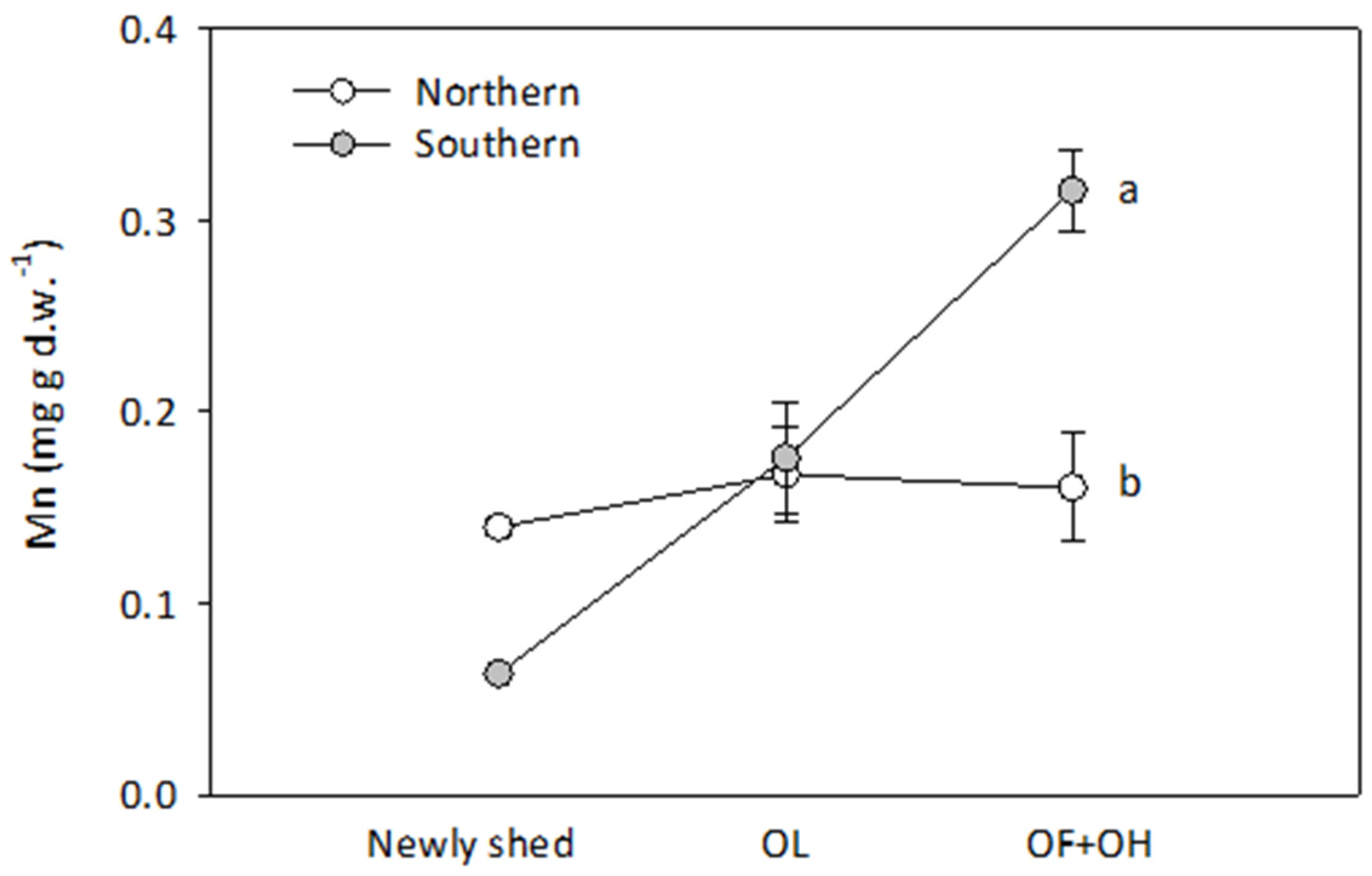 Figure 2. Mn concentrations in newly-shed leaves and floor litter in a northern and a southern beech forest. Values for newly-shed litter are means ± standard error; n = 9. Values for forest floor are means ± standard error; n = 36 (6 sampling plots, 2 sampling seasons, 3 replicate analyses); different lower-case letters indicate significant differences between sites (t-test; overall significance level = 0.05).