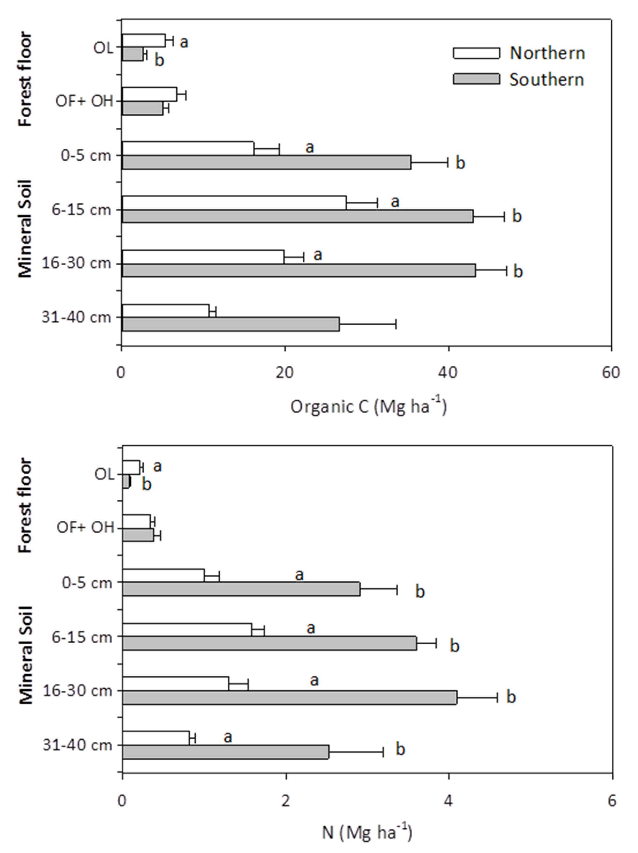 The organic C and N pools in the forest floor of SF were smaller than in the northern forest (Figure 3 and Figure 4, and Table 2).