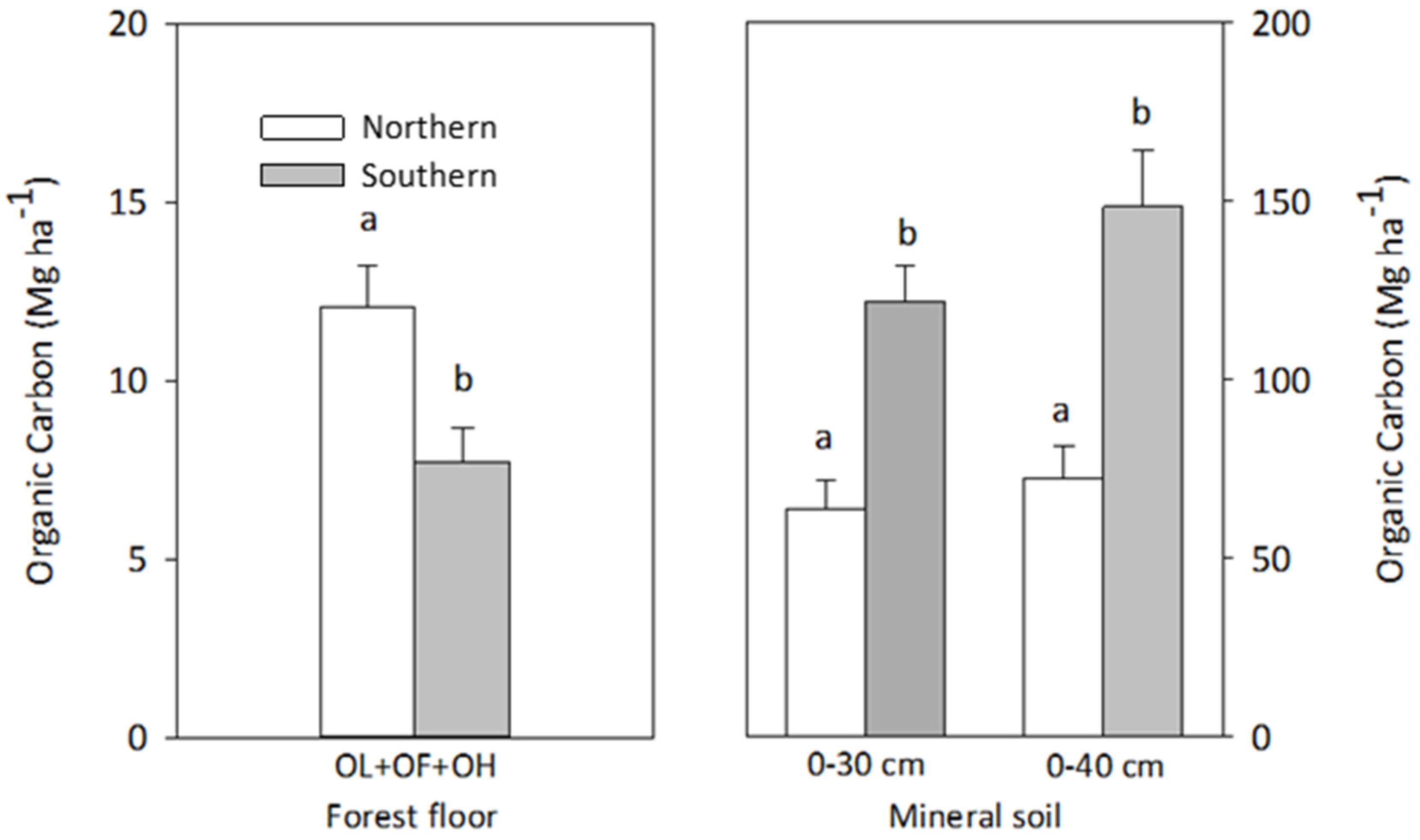 Figure 4. C stocks in forest floor and mineral soil in a northern and a southern beech forest. C stocks in the mineral soil 0–30 cm depth are reported for comparison with INFI data. Values are means ± standard error; n = 36 (6 sampling plots, 2 sampling seasons, 3 replicate analyses). Different lower-case letters indicate significant differences between sites (t test; overall significance level = 0.05).