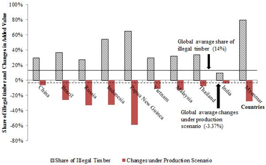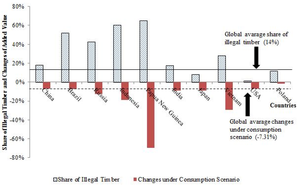 3.2. Economic Effects of Eliminating Illegal Timber Consumption on the Main Consuming Countries