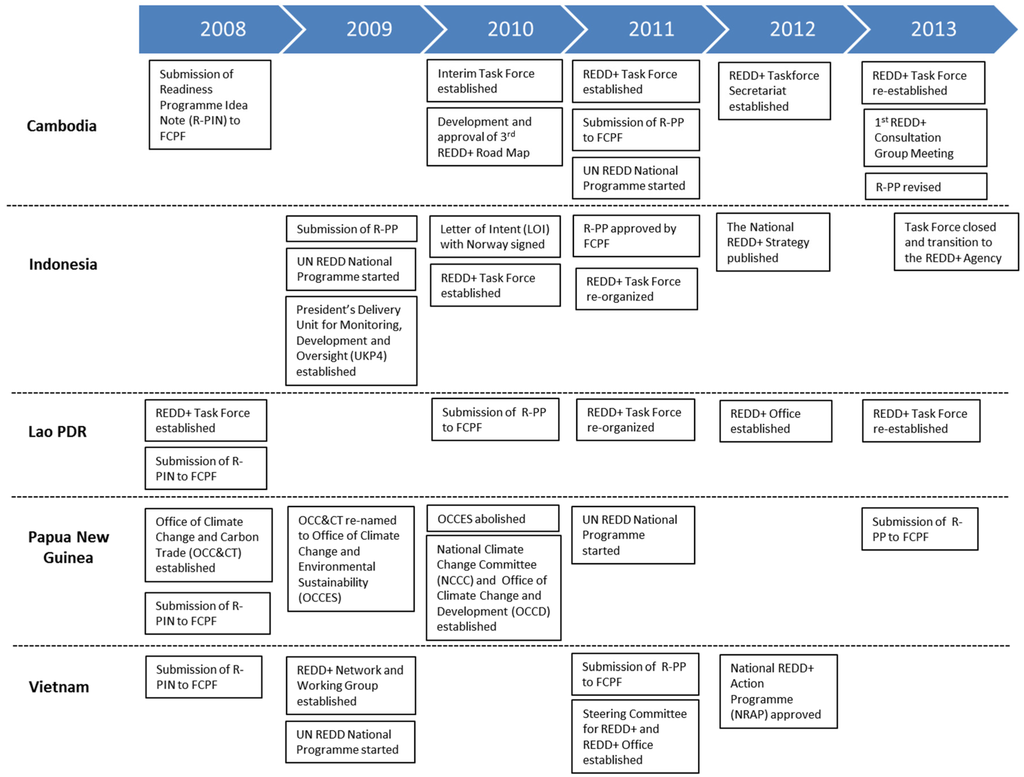As the main management and coordination body to develop REDD+ Readiness, a special government unit or management office was set up in each of the five countries: REDD+ Taskforce in Cambodia (2010–now), National REDD+ Task Force in Indonesia (2010–2013), REDD+ Task Force in Lao PDR (2008–now), and the Office of Climate Change and Development (OCCD) in Papua New Guinea (2010–now). In Vietnam, the REDD+ Steering Committee (2011–now) supported by the National Network (2009–now) is viewed equivalent to this operating level (detailed discussion is given below). These organizations are considered as the main government instrument for REDD+ Readiness in each country, as they are directly responsible for the formulation of national strategy, managing overall development of REDD+ activities, and taking the lead in coordinating measures over stakeholders. To provide support in terms of administrative operations, Cambodia, Lao PDR and Vietnam set up secretarial offices. National REDD+ Task Force in Indonesia and the OCCD in Papua New Guinea are provided with the necessary administrative capacities.