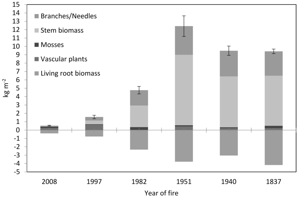 Disturbances are an important factor influencing forest structure formation, composition and forest functioning [1,2]. Forest fires and the long-term recovery from them are important for regional carbon (C) storage because C lost in fires makes a substantial difference to regional C budgets [3]. Boreal forests are a crucial part of the climate system since they contain about 60% of the C (703 billion tons) bound in global forest biomes [4]. It is expected, that the average temperature increase predicted for the future climate will be most pronounced in the boreal region and the fire frequency, intensity and severity in boreal forests will increase as a result of prolonged drought periods [5].