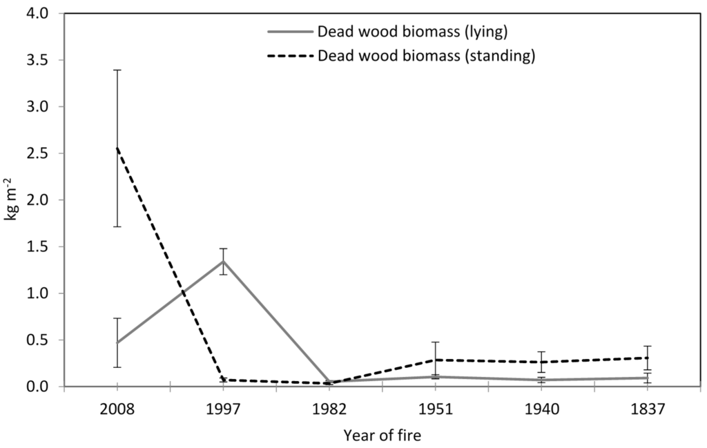 Average standing and lying dead wood biomass (kg·m−2) in a fire chronosequence.