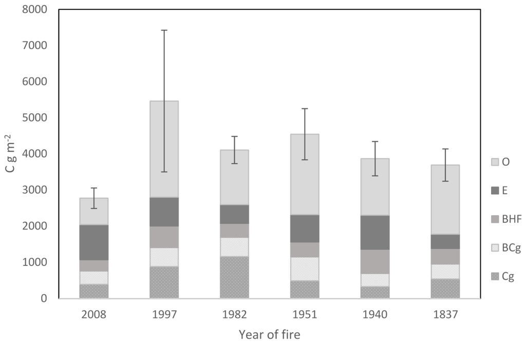 Average soil C content (C·g·m−2) in different horizons (O-/E-/BHF-/BCg-/Cg-horizon) in a fire chronosequence.
