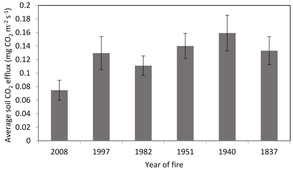 In previous studies it has been found that the soil CO2 efflux is lower in recently burned areas and higher in the areas where more time has elapsed since the last fire [13,33,34,35]. Similarly, this study revealed that soil respiration was lowest in the area where the last fire occurred most recently in 2008. It has been found that it may take 3–10 years for post-fire soil CO2 efflux recovery [36,37], and the main factors affecting it are the vegetation type, vegetation coverage and post-fire biomass recovery [38,39], which contribute to the formation of new SOM. However, in our study somewhat longer recovery period was observed. Therefore, it can be assumed that in the 2008 fire area SOM has not recovered and since the main soil CO2 efflux occurs mainly in the upper soil layers (O-horizon) the soil CO2 efflux is lower. The main reason why the SOM has not recovered was the original site and fire severity. Pine forests in our study areas are growing on sandy soils where the organic layer of soil was thin. With stand replacing fire almost all the organic soil layer was burned and it is difficult for tree regeneration and ground vegetation to establish on pure sand. In some areas it was also noticed some movement of the sand (when the sand was exposed after fire), thus it is understandable that seven years after fire disturbance ground vegetation coverage, that is the most important source for new SOM establishment, was not completely recovered. In addition, also the root respiration (other important component of the soil CO2 efflux) is lower as the vegetation has not fully recovered. In spring and summer, during active root growth, root respiration can account for 62% of the total soil CO2 efflux, and in the autumn the proportion may be only 16% [40]. Thus, the soil CO2 efflux may also be elevated due to the increase in root respiration, which in turn is caused by raise in soil temperature.