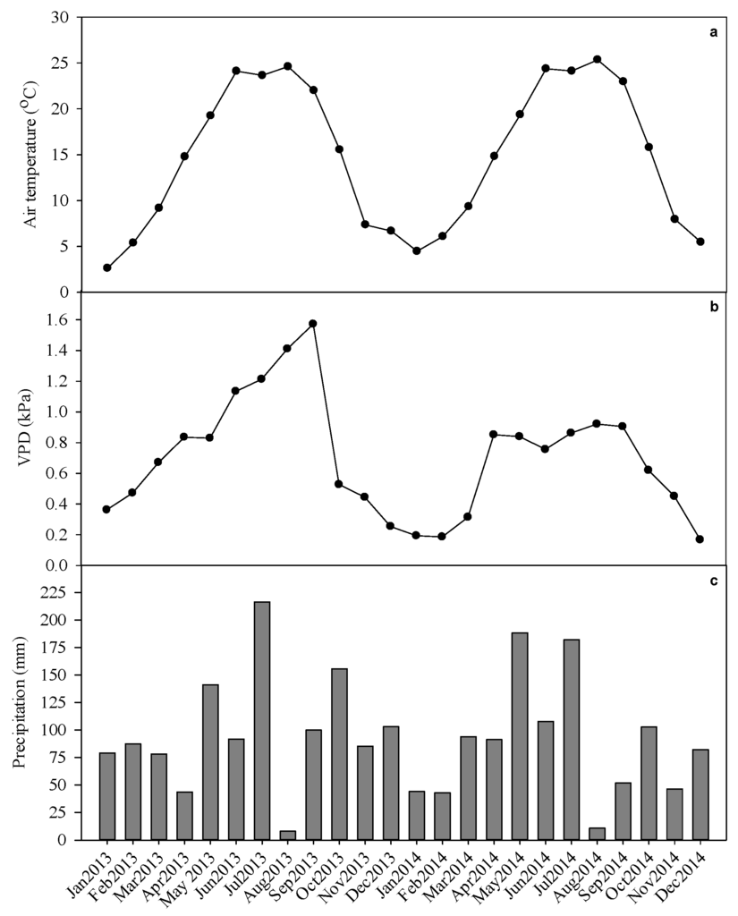 - Will, R.E.; Wilson, S.M.; Zou, C.B.; Hennessey, T.C. Increased VPD due to higher temperature leads to greater transpiration and faster mortality during drought for tree seedlings common to the forest-grassland ecotone. New Phytol. 2013, 200, 366–374. [Google Scholar] [CrossRef] [PubMed]