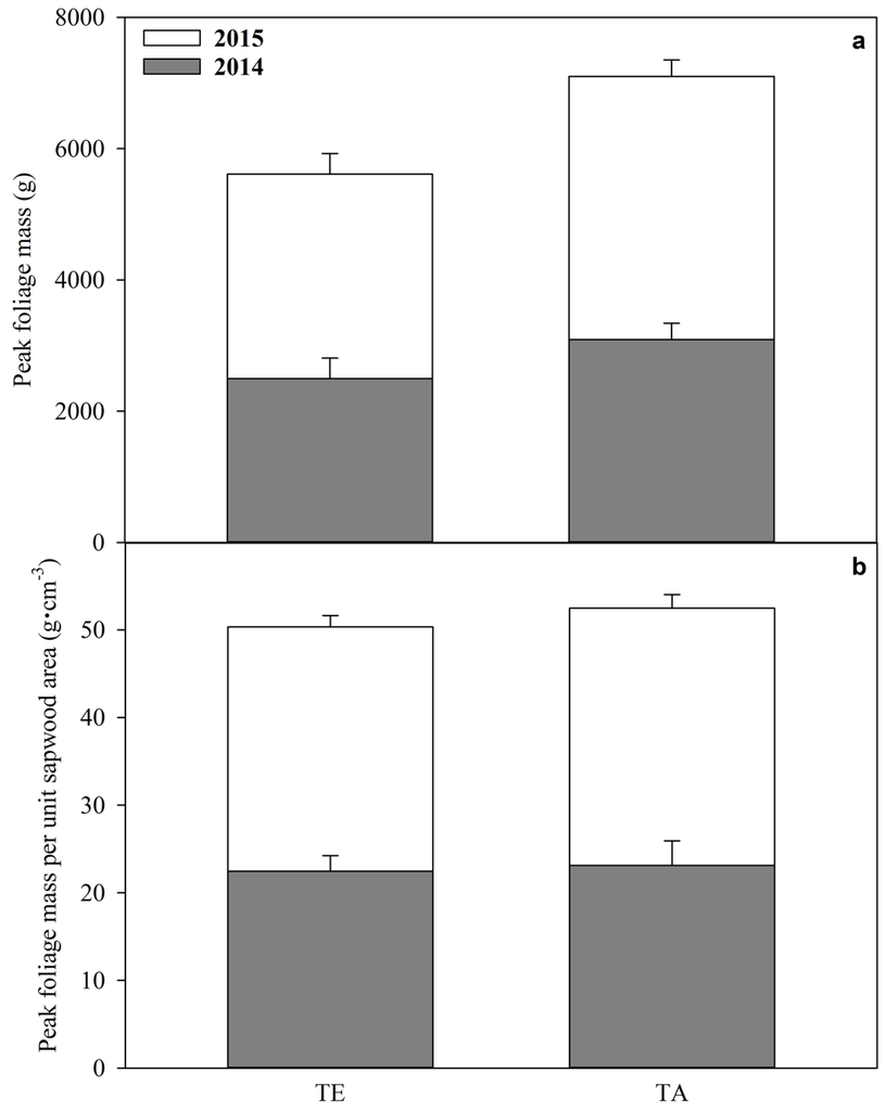 | Peak Foliage Mass | Peak Foliage Mass Per Sapwood Area | ΨL | δ13C | N | Height | DBH | Volume | |
